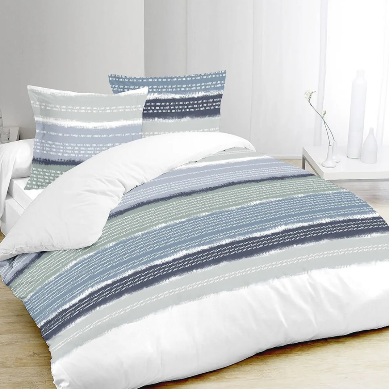 Parure de lit pour 2 personnes blanche à bandes imprimées gris, bleu et vert comprenant: