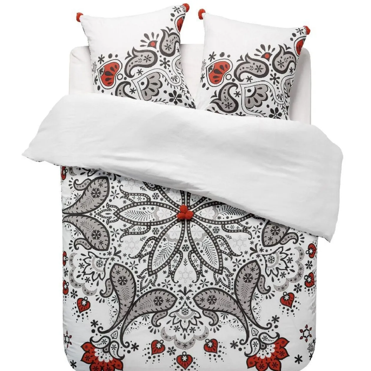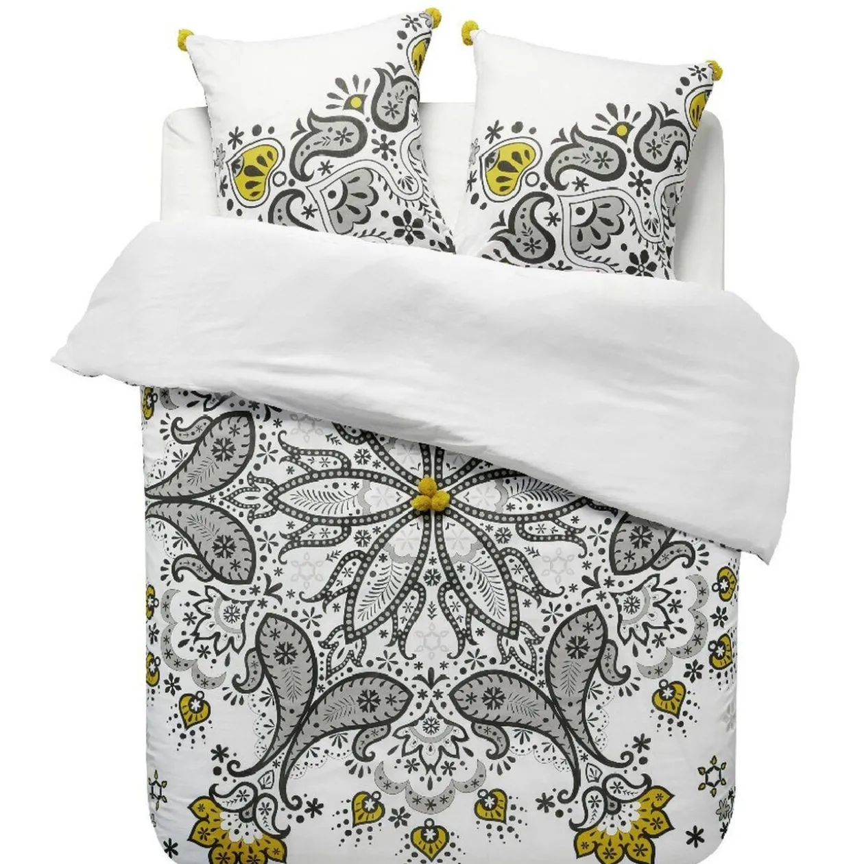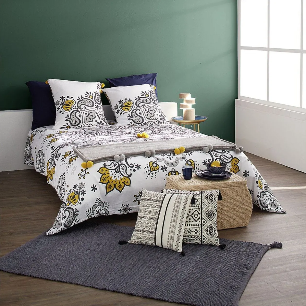 Parure de lit 2 places blanche avec motif mandala et pompons de couleur jaune ou rouge teck. Coloris aléatoires selon disponibilité en stock magasin.
