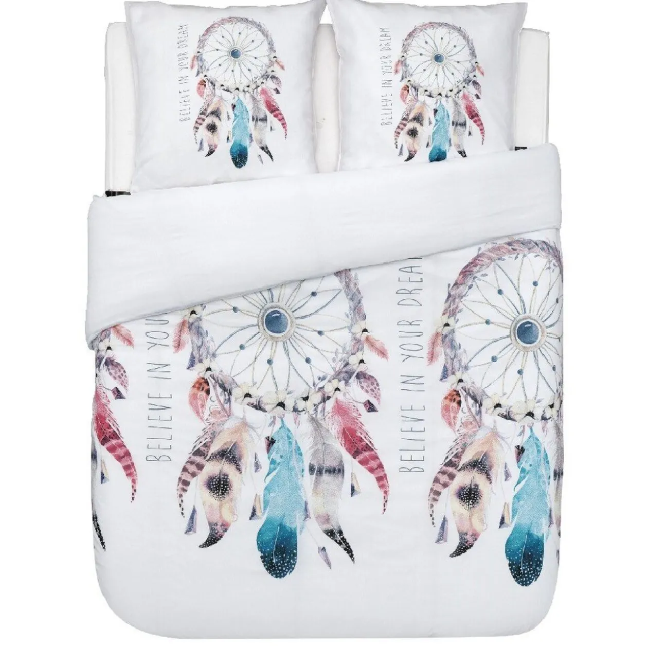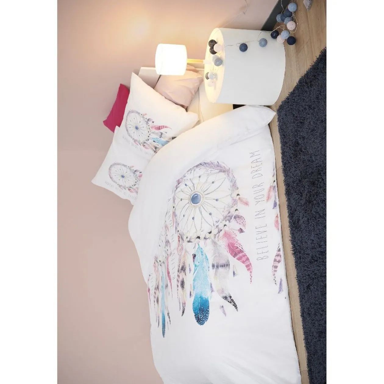 Cette parure de lit blanche imprimée attrape-rêves comprend une housse de couette à 2 places 220 x 240 cm et deux taies d’oreiller carrées coordonnées 63 x 63 cm.