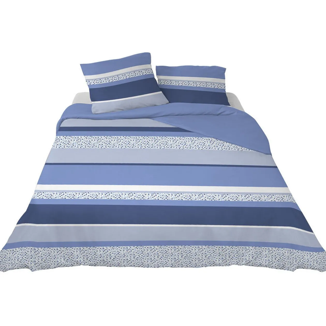 Parure de lit 2 places de couleur bleu et blanccomprenant 1 housse de couette dim. 220×240 cm et 2 taies d’oreillers dim. 63×63 cm, coton 57 fils.