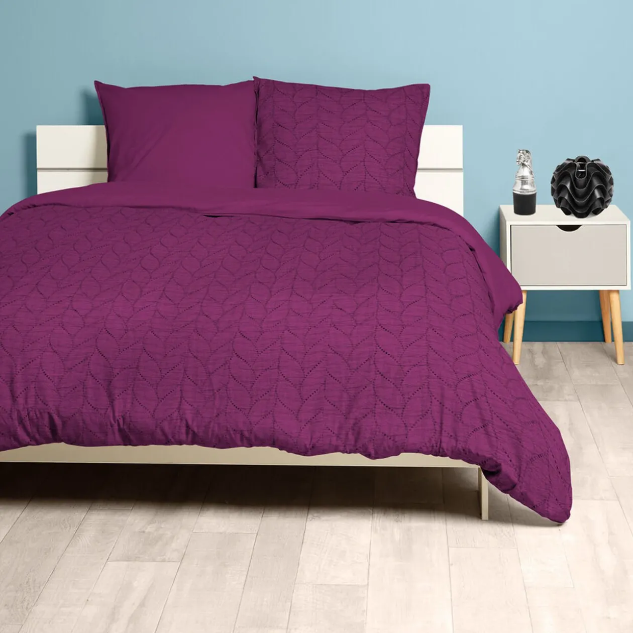 Cette parure de lit bi-face prune pour 2 personnes comprend une housse de couette au dessus matelassé 220 x 240 cm et deux taies d’oreiller carrées coordonnées 63 x 63 cm.