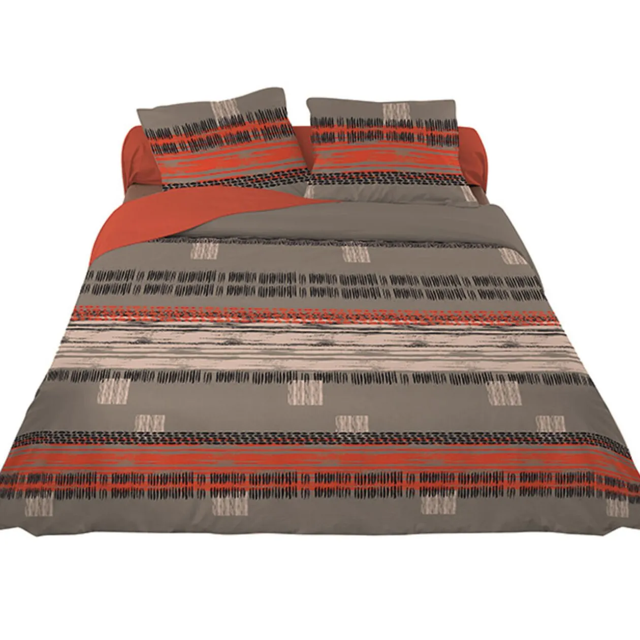 Parure de lit 2 places comprenant 1 housse de couette dim.220×240 cm,1 drap-housse 140×190 cm, 1 drap plat dim. 240×300 cm, 1 taie de traversin dim. 45×185 cm et 2 taies d’oreillers dim. 63×63 cm, polyester microfibre. Coloris : orange, gris, beige et noir.