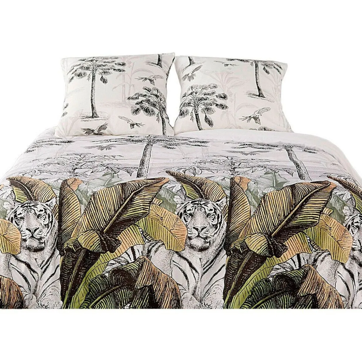 Ce produit existe en 2 modèles: feuilles/géométrique, modèles aléatoires en fonction de la disponibilité en magasin. Cette parure est composée d’une housse de couette – Dimensions: l 240 x L 220 cm, 2 taies d’oreilles – Dimensions: l 63 x L 63 cm. – Matière: Polyester.