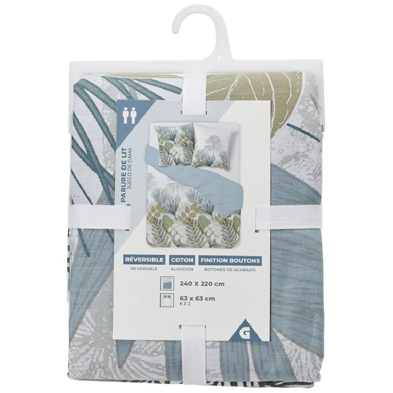 Parure réversible blanc écru d’un côté et bleue de l’autre en coton pour un lit 2 personnes avec une finition bouton.
