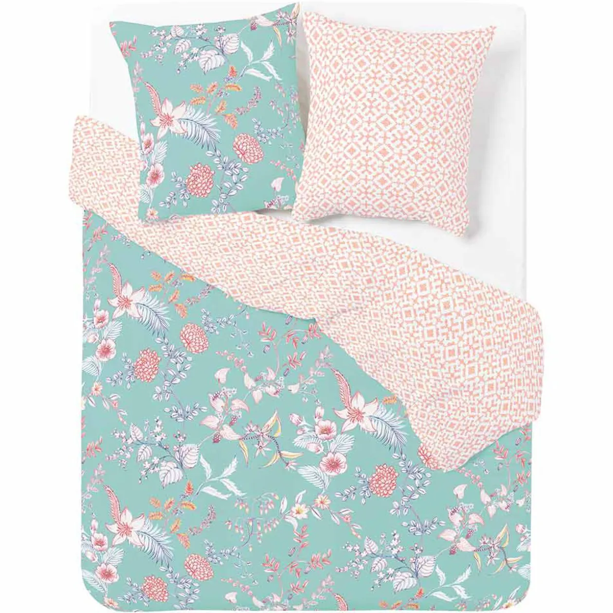 Parure de lit à imprimé floral corail et bleu pour 2 personnes. Cette parure comprend une housse de couette et ses deux taies d’oreillers assorties.