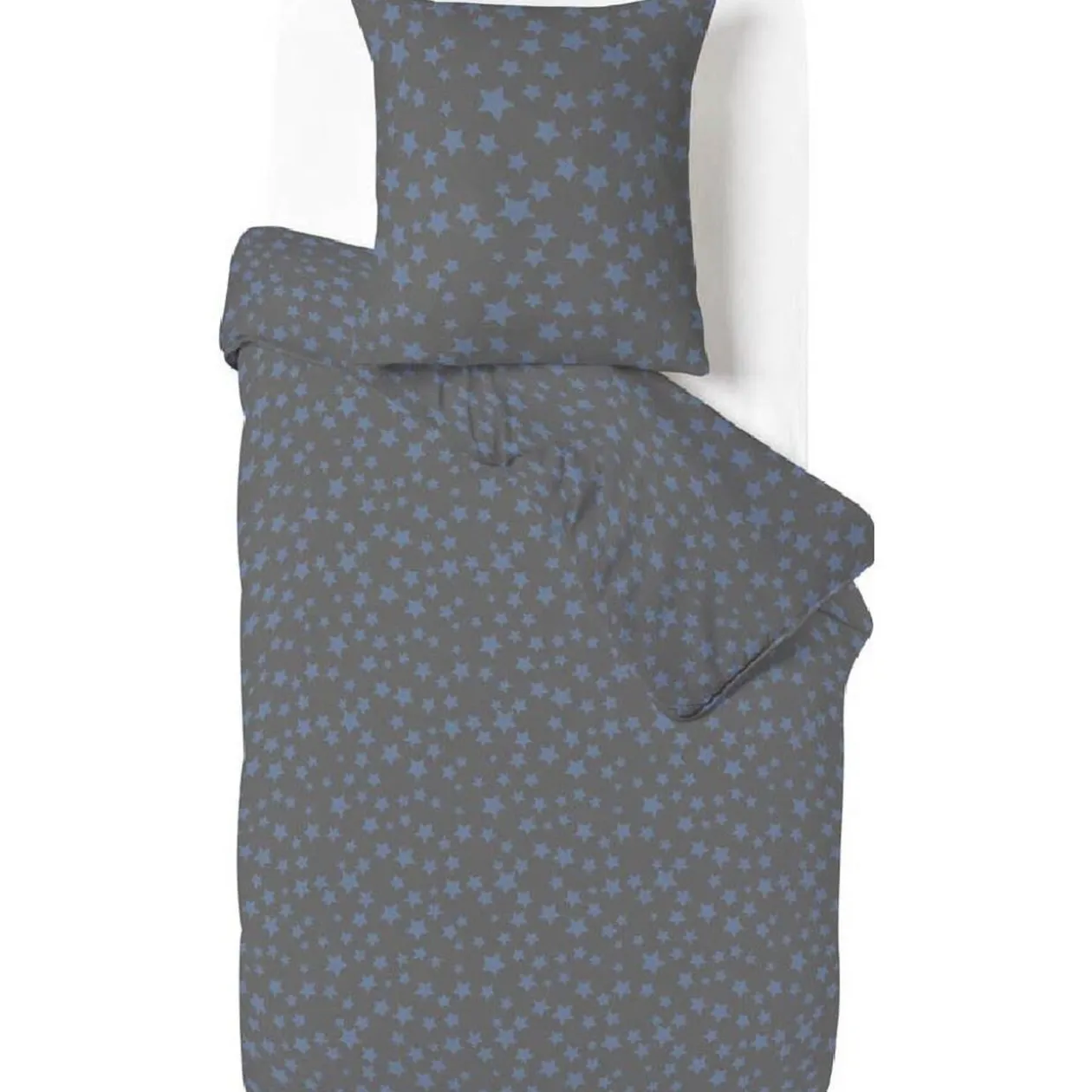 Parure de lit grise avec motifs étoiles bleues. Cette parure comprend une housse de couette et sa taie d’oreiller assortie.