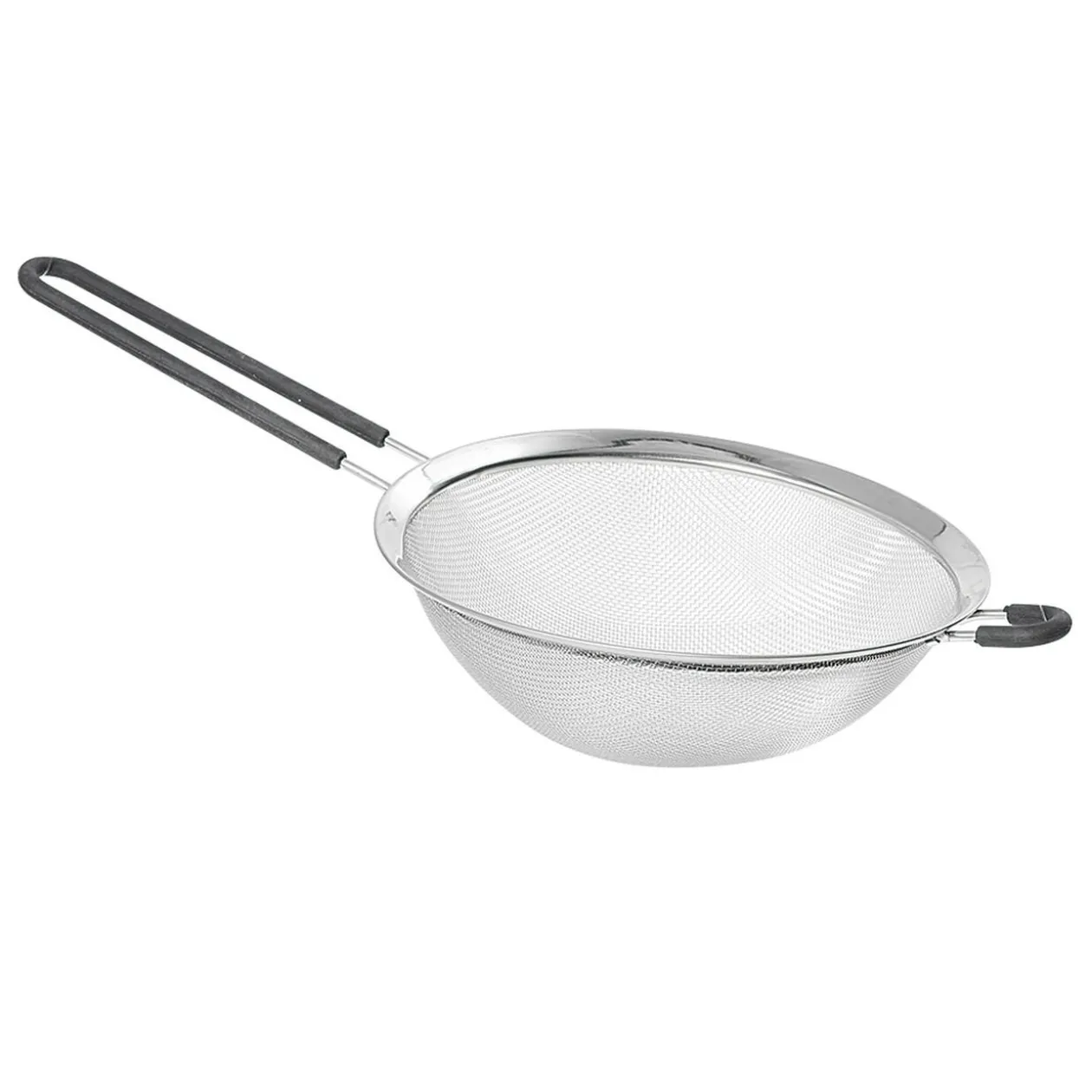 Passoire en inox à maille fine avec embout et longue poignée en silicone pour la poser sur les rebords de l’évier ou d’un récipient.