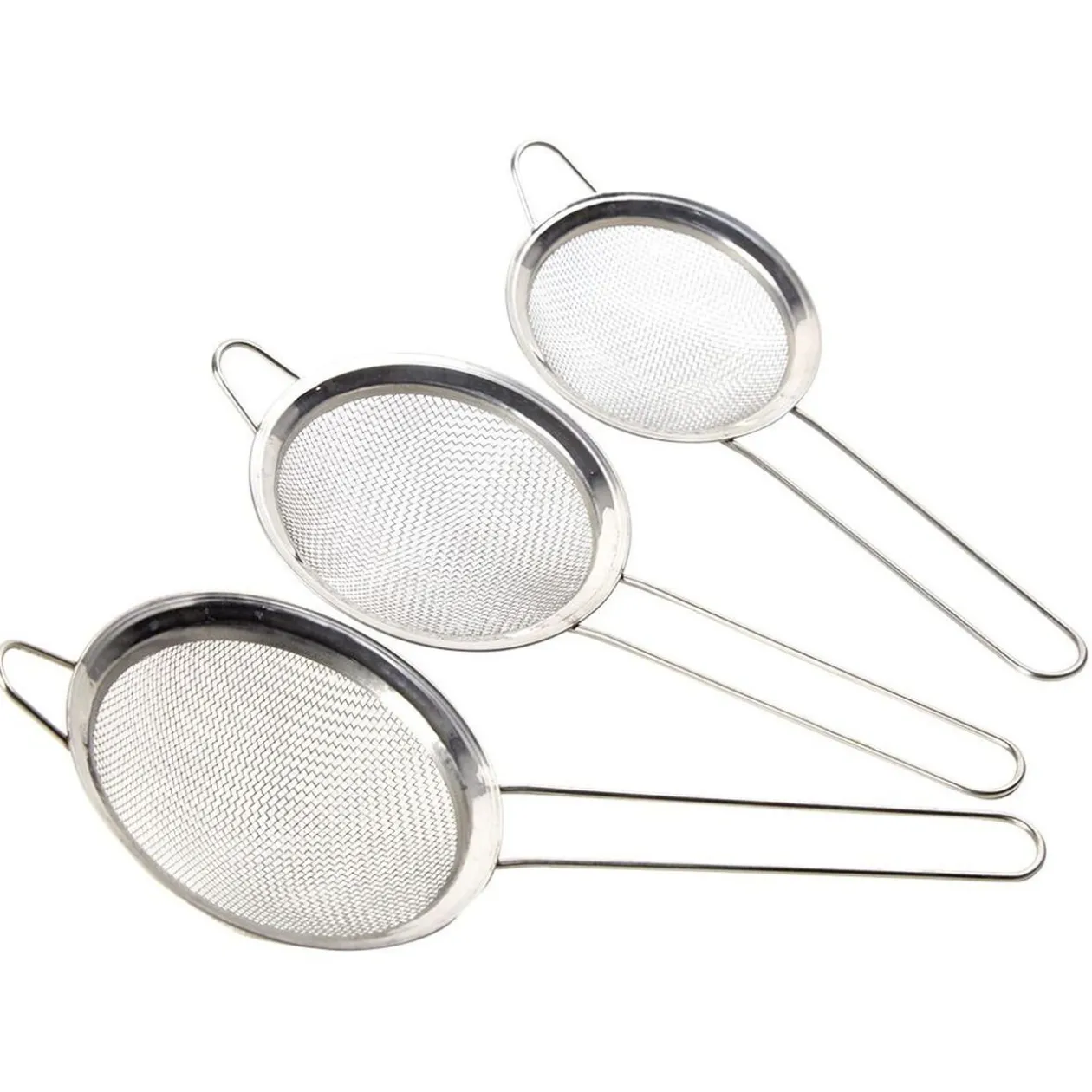 Lot de 3 passoires en inox de couleur blanc argenté.