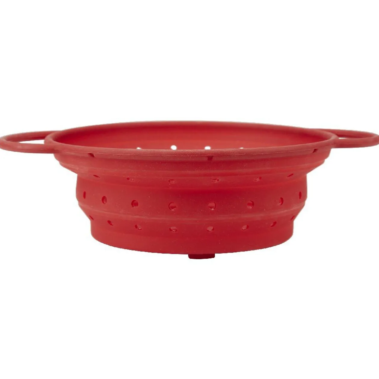 Passoire rétractable rouge en silicone. Très pratique, notamment pour un gain de place.