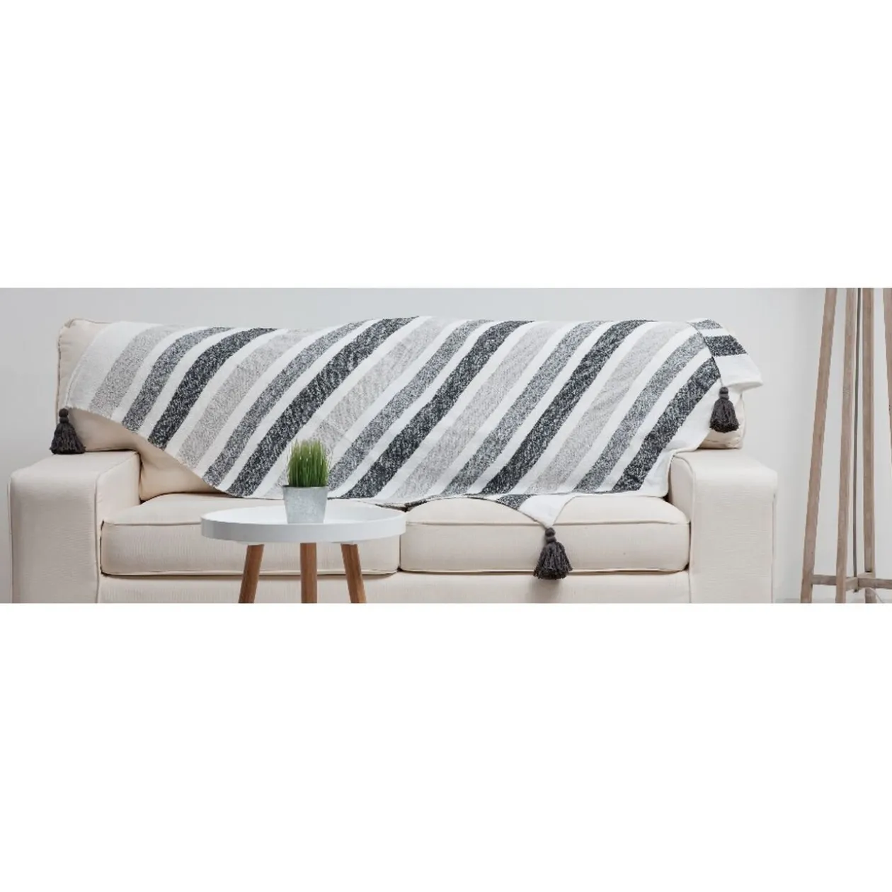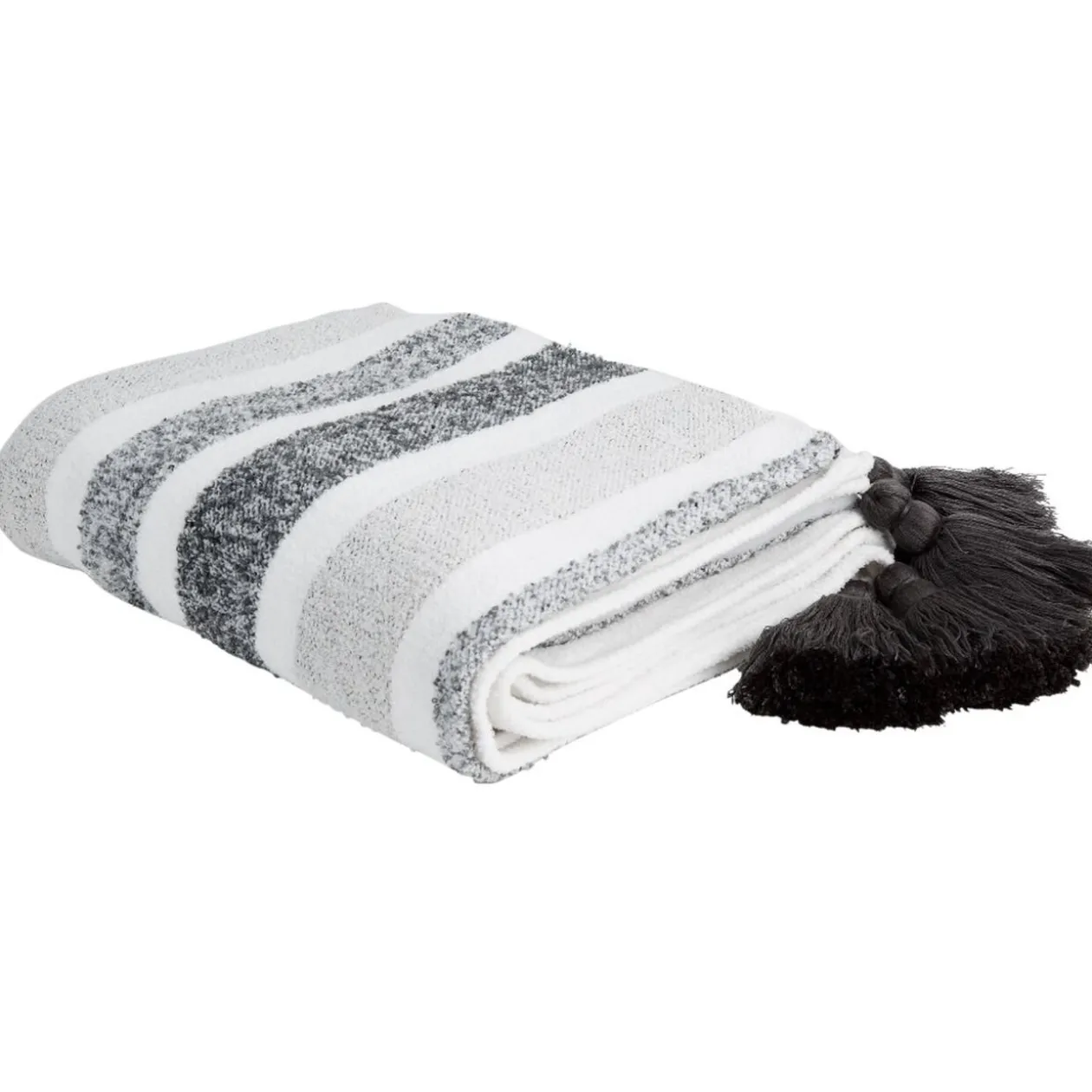 Ce produit existe en 2 modèles, modèle aléatoire selon disponibilité en magasin – Couleur : Fond blanc avec bandes grises claires et grises foncées et pompons noirs ou fond blanc avec bandes roses et oranges et pompons rouges- Dimensions : L130 x H160 cm – Matière : polyester