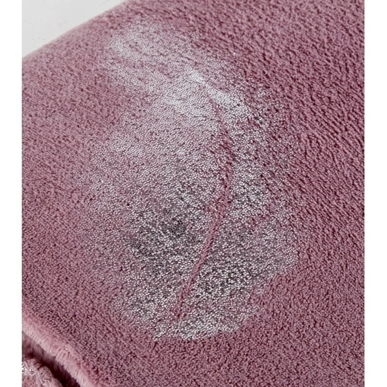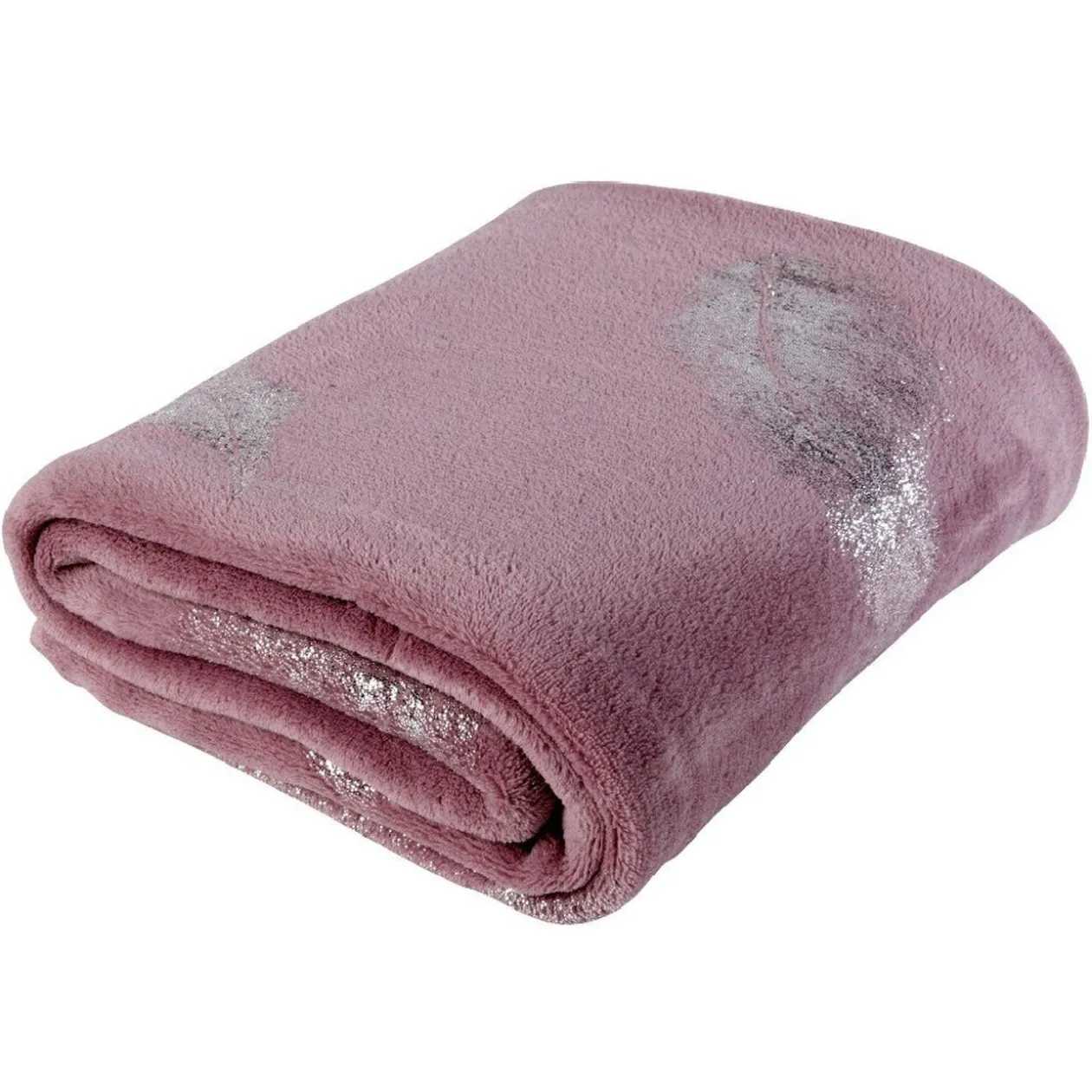 Plaid rose design plumes argentées pailletées, dim. 127×152 cm, 100% polyester.