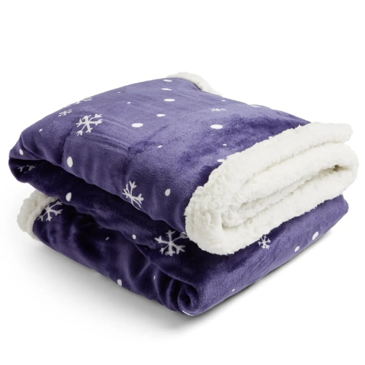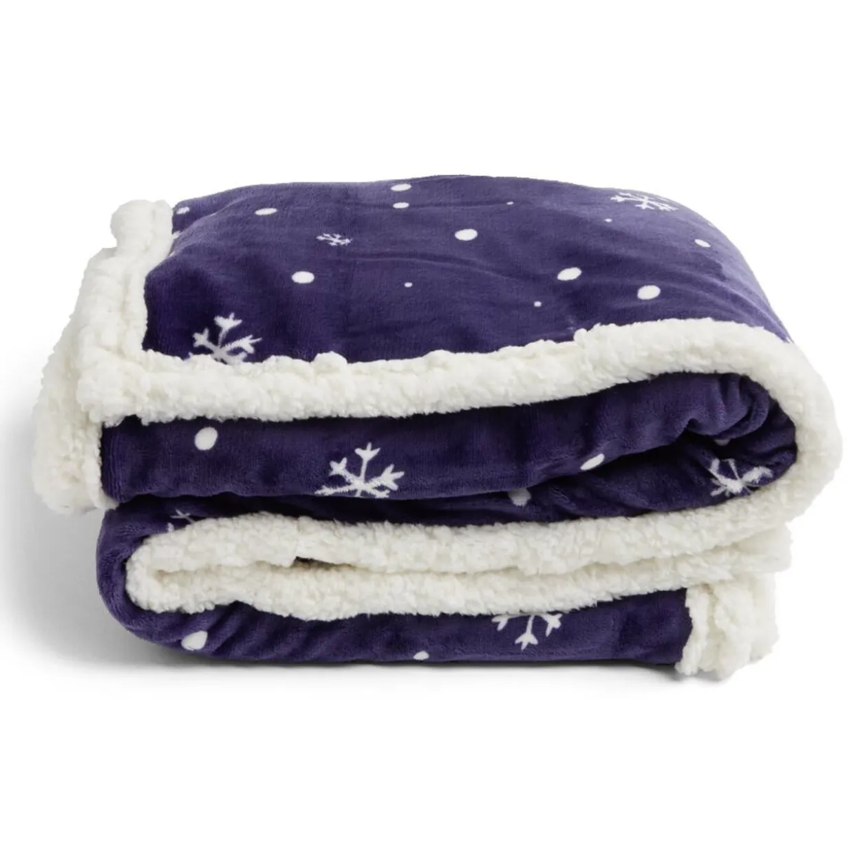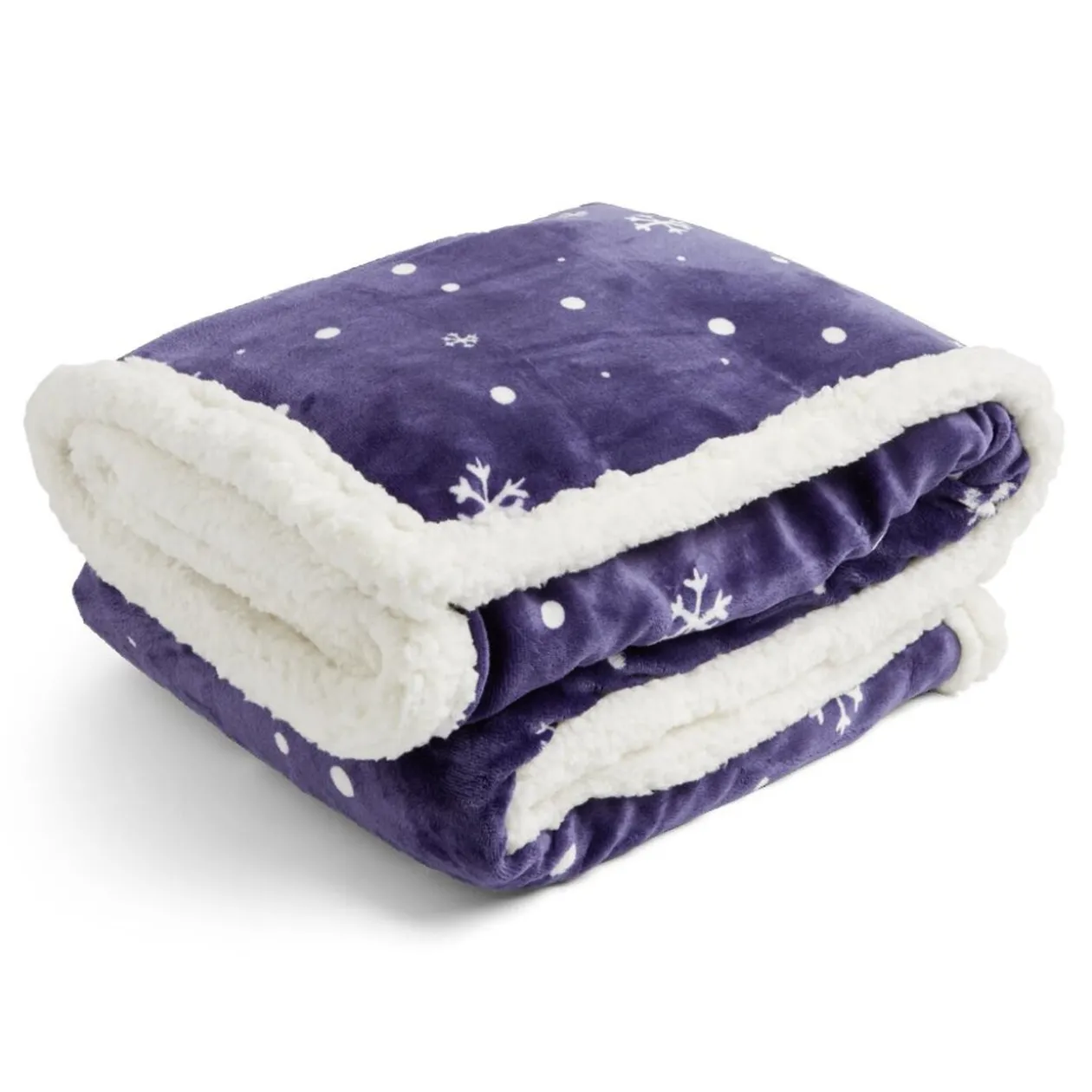 Ajoutez une note de douceur et de chaleur à votre décoration de Noël avec ce plaid sherpa en flanelle à motif flocon bleu et blanc.