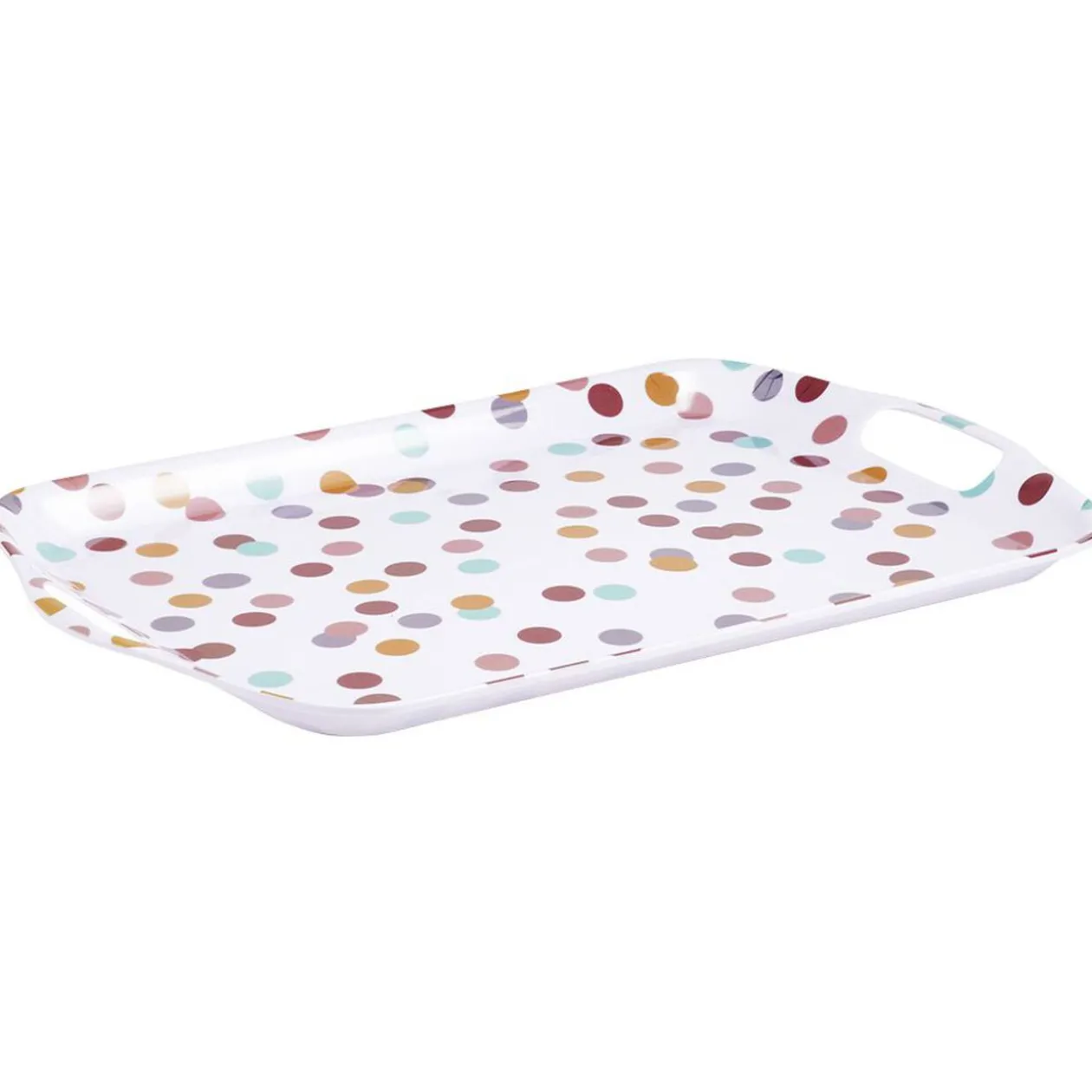Plateau en plastique mélaminé imprimé pois multicolores.