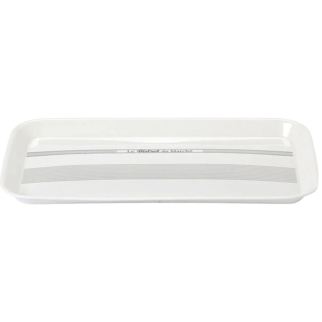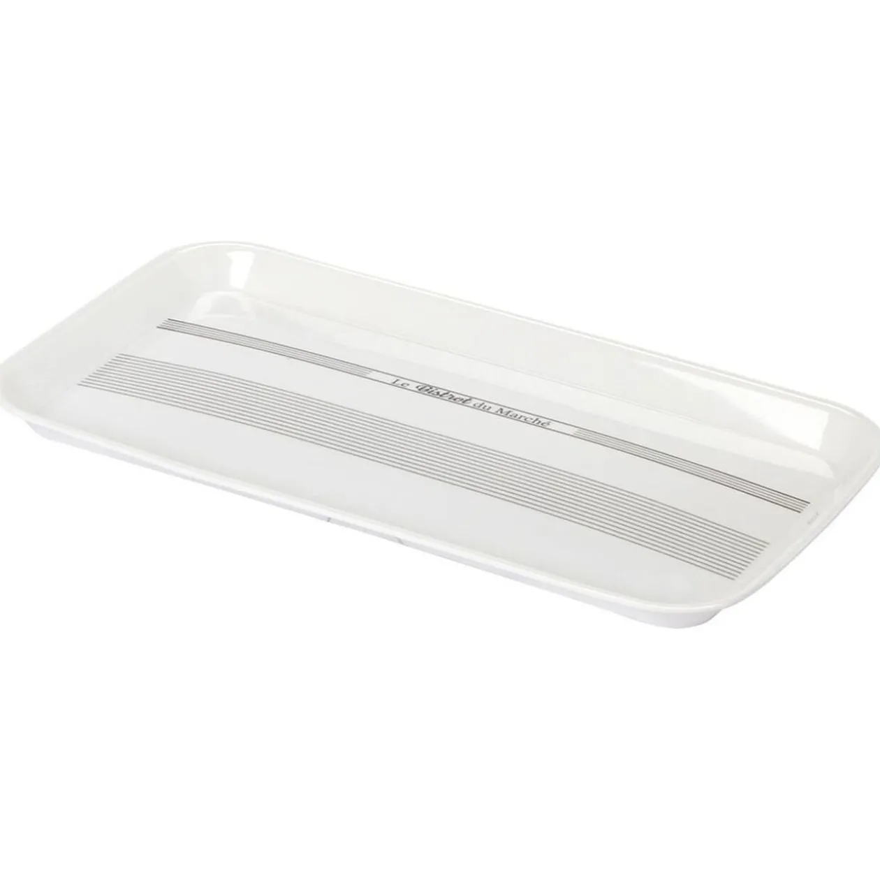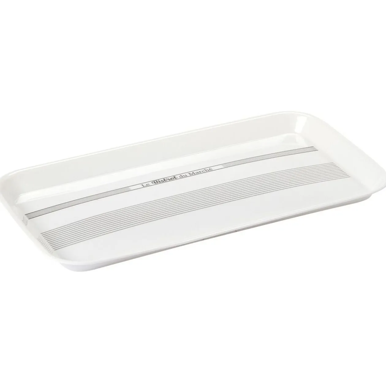 Plateau en plastique mélamine blanc écritures noires.