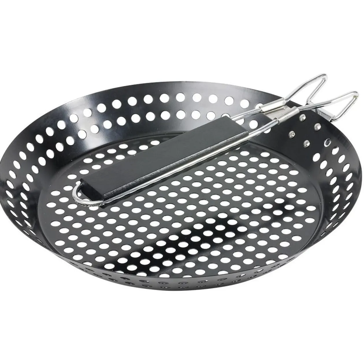 Poêle à trous fabriquée en acier au carbone avec revêtement antiadhésif pour cuire les marrons et chataîgnes au feu de bois.