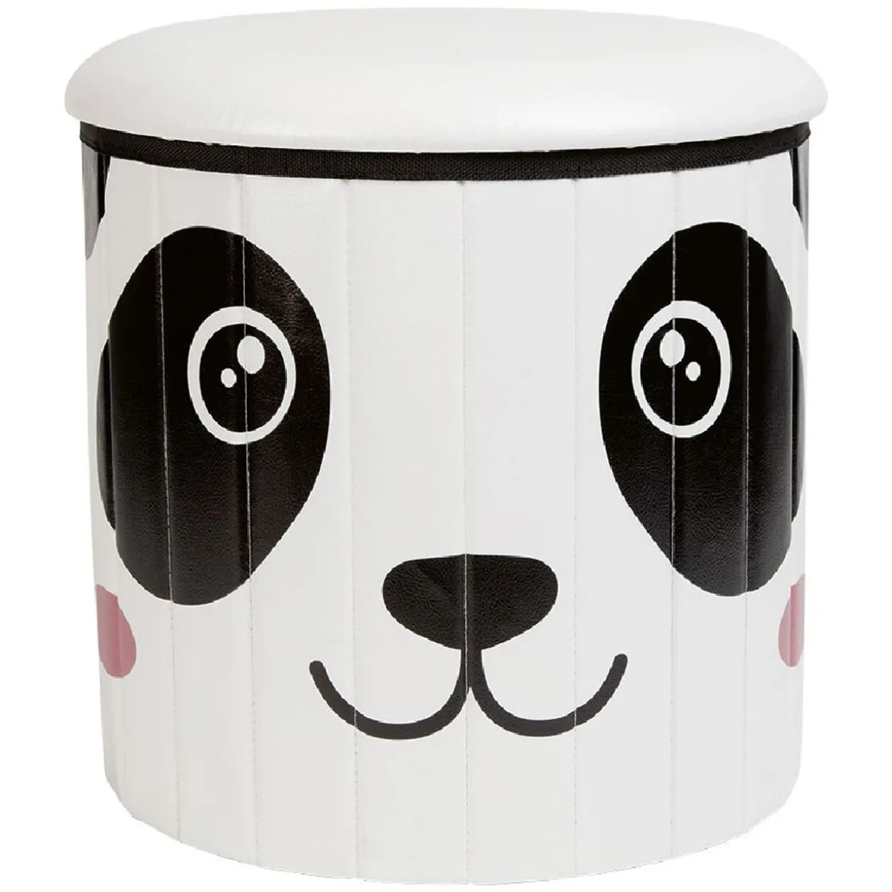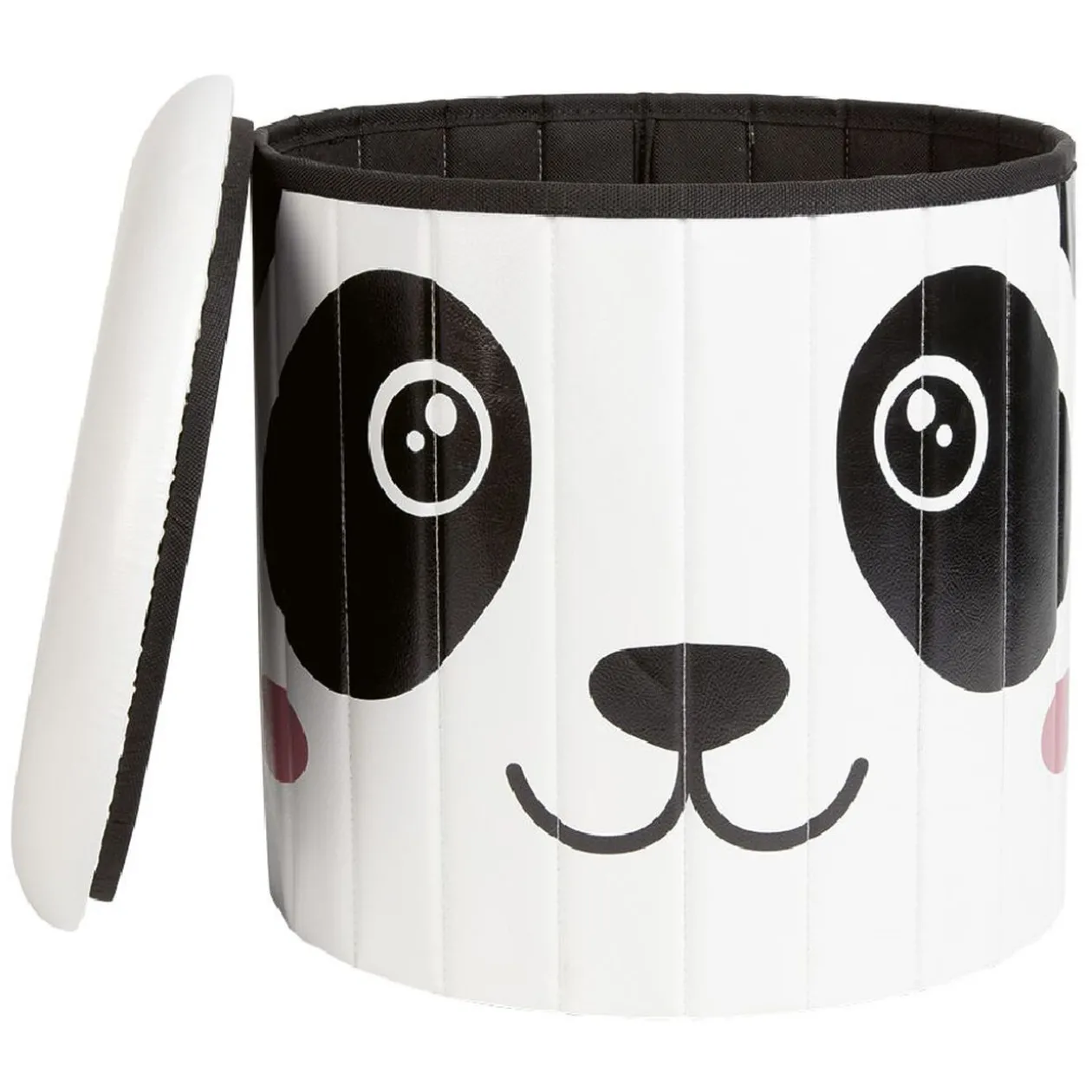 Ce pouf coffre blanc et noir avec imprimé tête de panda est idéal pour une chambre d’enfant.