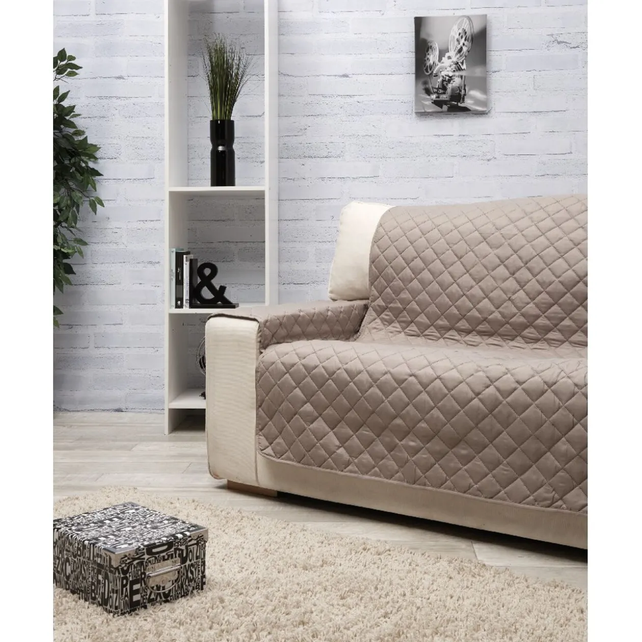 Protège canapé 3 places de couleur taupe uni.