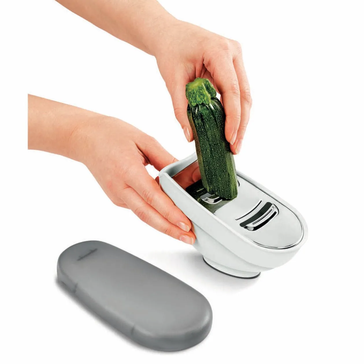 Râpe Metaltex multiusage 3 en 1. Idéale pour le fromage, le chocolat, les légumes et beaucoup d’autres aliments. Selon votre plat, vous pourrez choisir entre les 3 lames pour râper plutôt épais, finement ou tranché, et ne risquerez pas de glisser ou vous couper grâce à sa basse anridérapante.