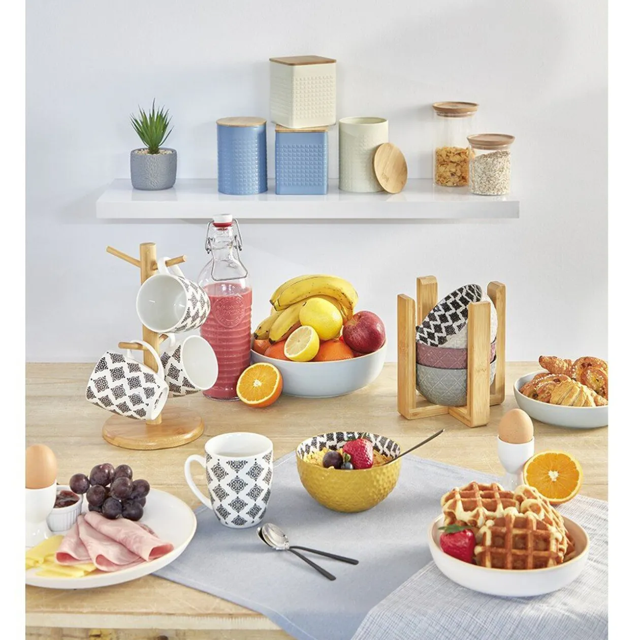 Set 4 mugs décor arabesque noir et blanc et support en bambou