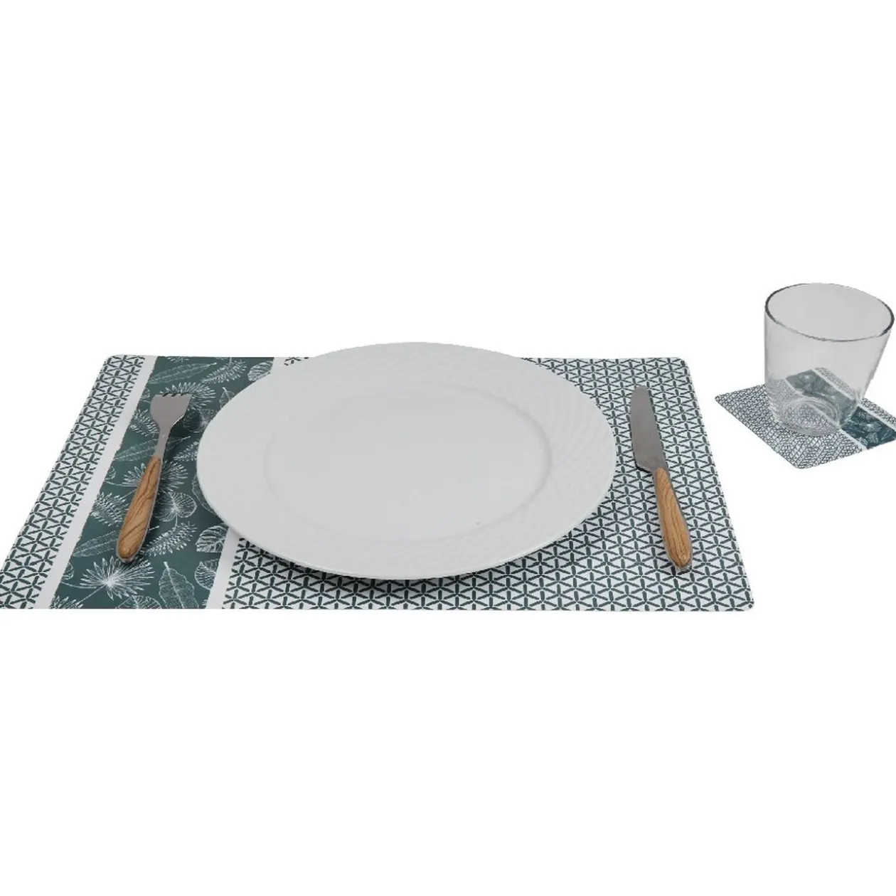Cet article comprend 6 sets de table en plastique et 6 sous verre assortis. Coloris blanc et vert d’eau, motif géométrique ultra tendance !