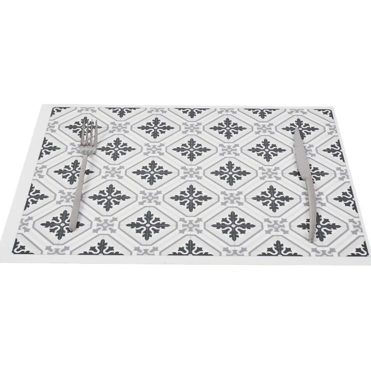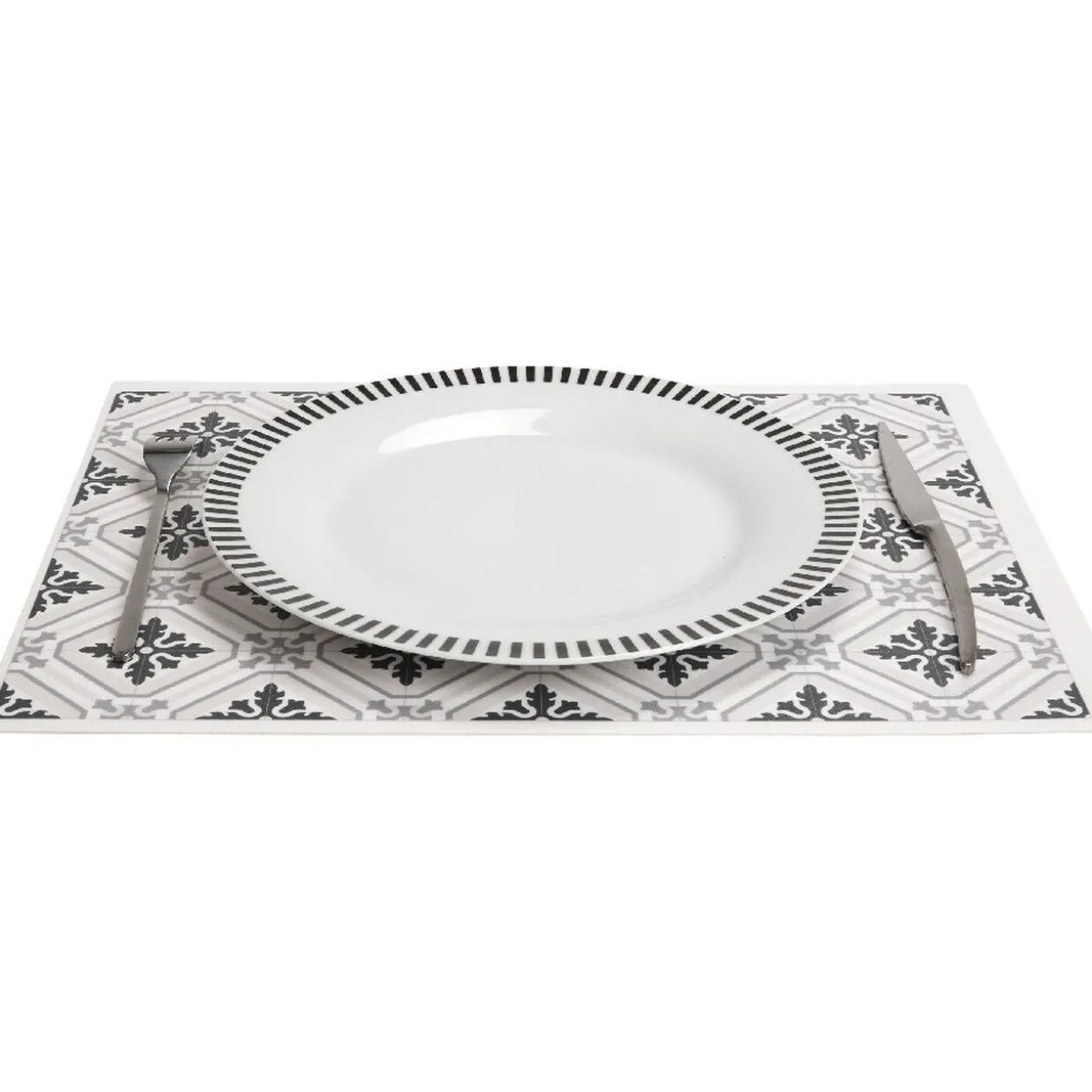 Joli set de table en plastique dans les tons blanc, gris et noir avec un motif régulier d’inspiration carreaux de ciment. Complétez votre déco de table avec des assiettes et des serviettes unies de couleur sobre ou vive selon l’ambiance souhaitée.