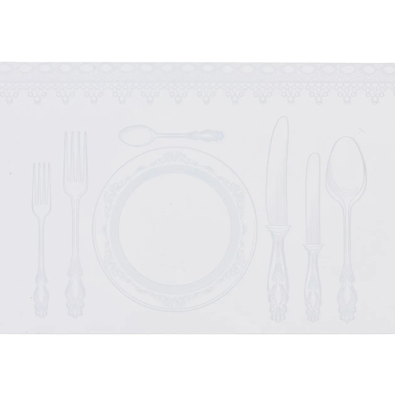 Ce set de table en pvc transparent avec imprimé aspect napperon et vaisselle de style baroque habillera avec élégance et raffinement votre table de salle à manger.
