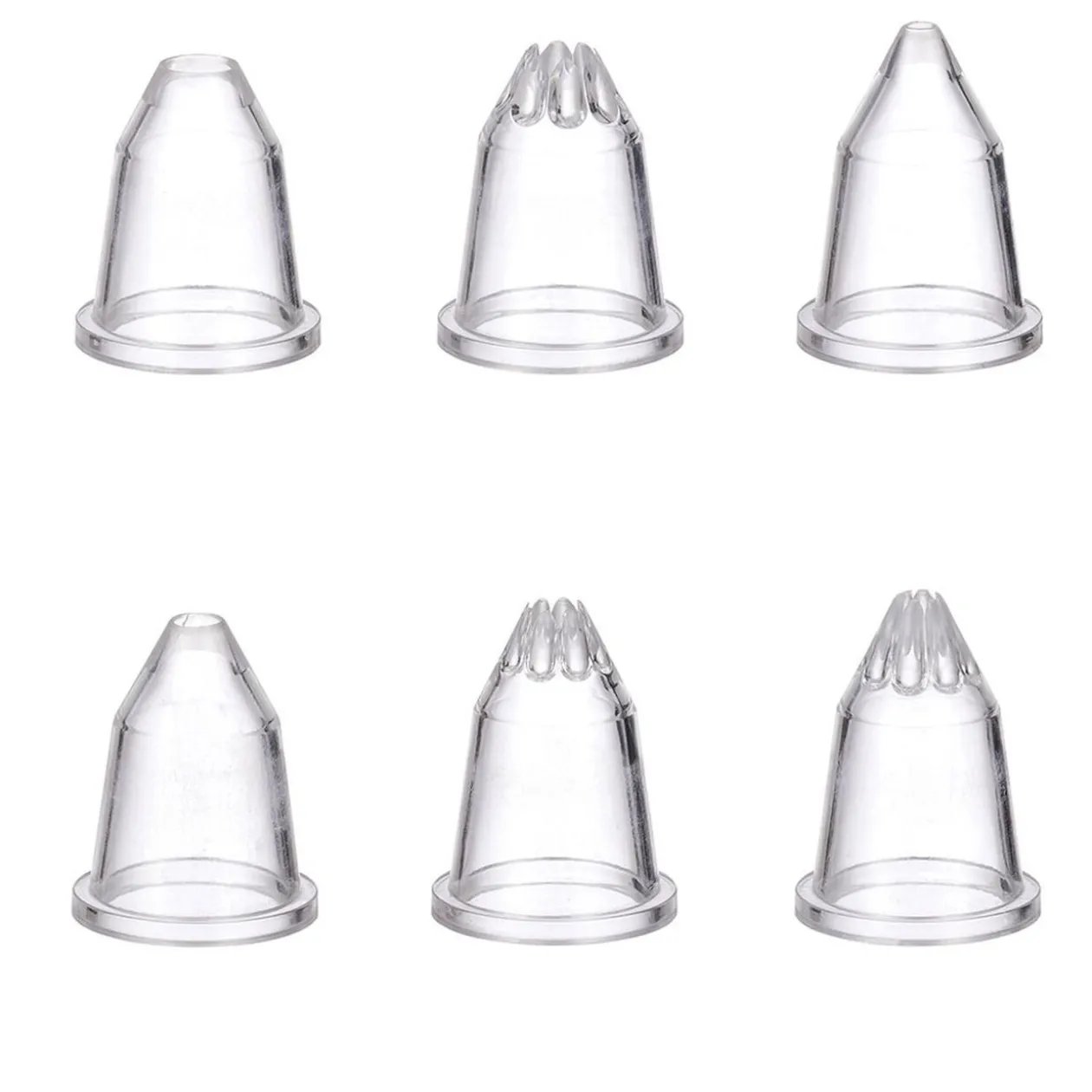 Set de 6 douilles avec support en plastique transparent pour la réalisation d’appétissants décors en pâtisserie.