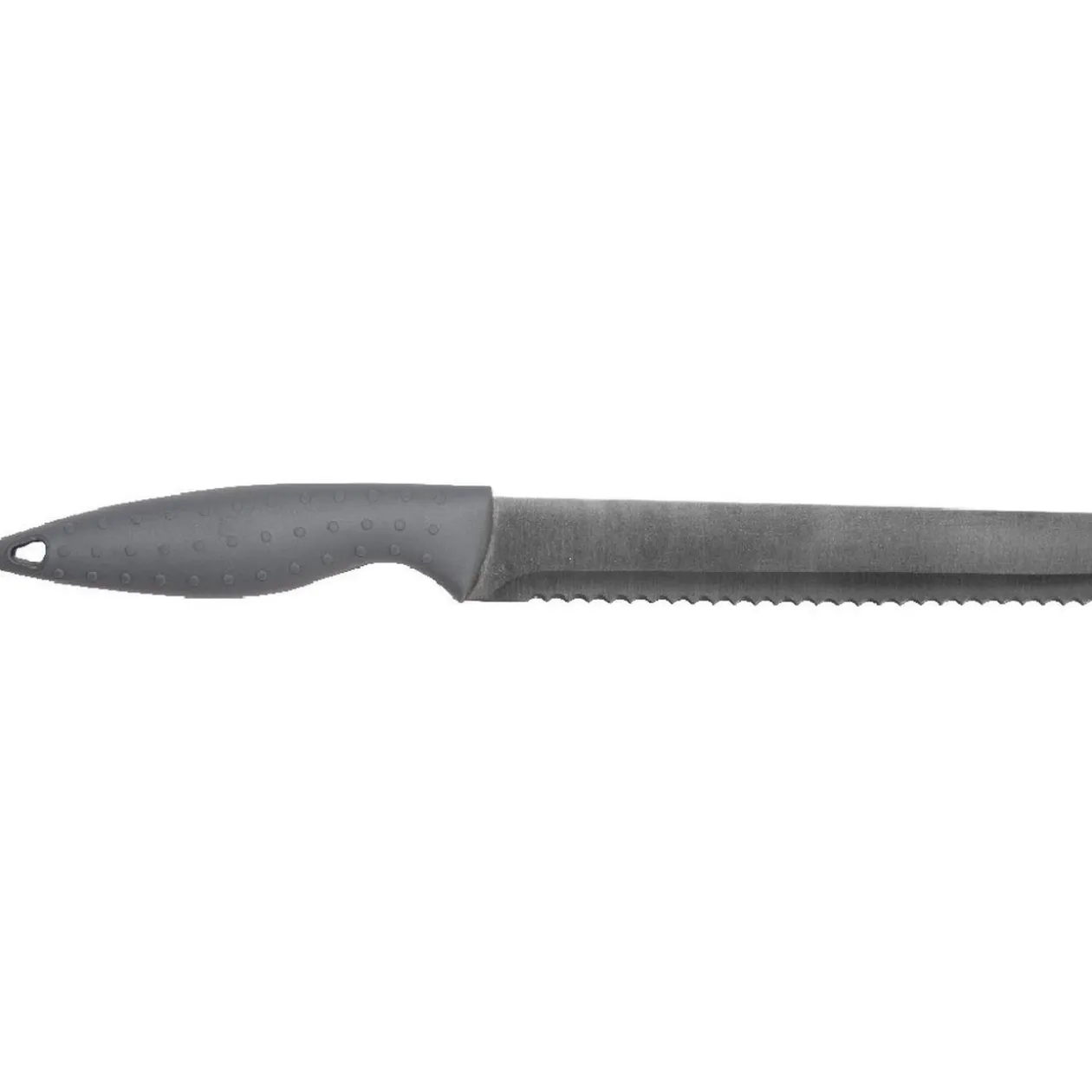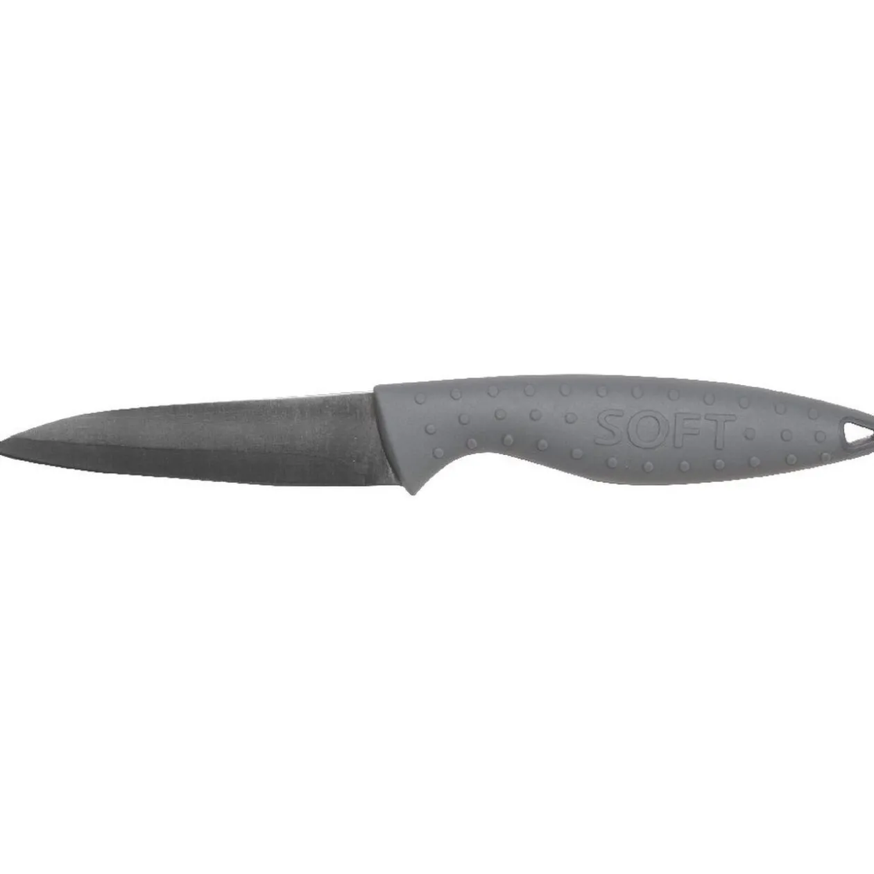 5 couteaux en inox avec manche soft gris L. 20 cm, 13,5 cm et 9,5 cm. Support rouge et noir en acrylique adaptable à tous vos couteaux.