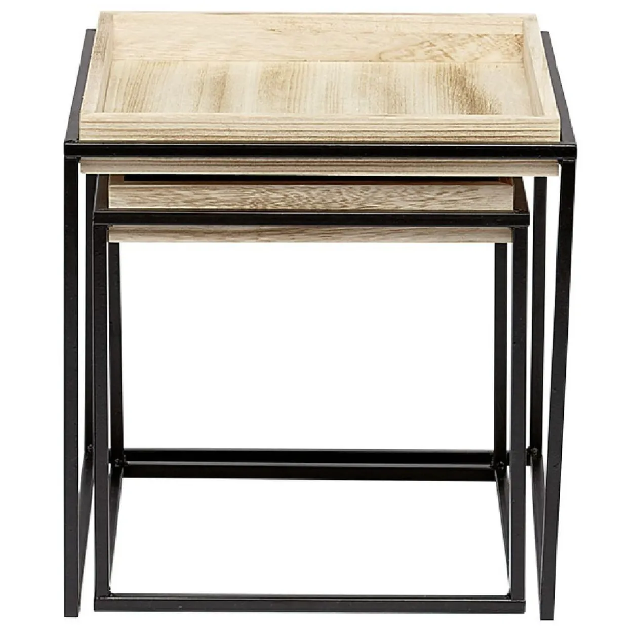 Ensemble de 2 tables gigognes carrées avec structure en métal noir et plateau en MDF (panneau de fibres de bois) naturel à utiliser ensemble ou séparément en tables d’appoint.