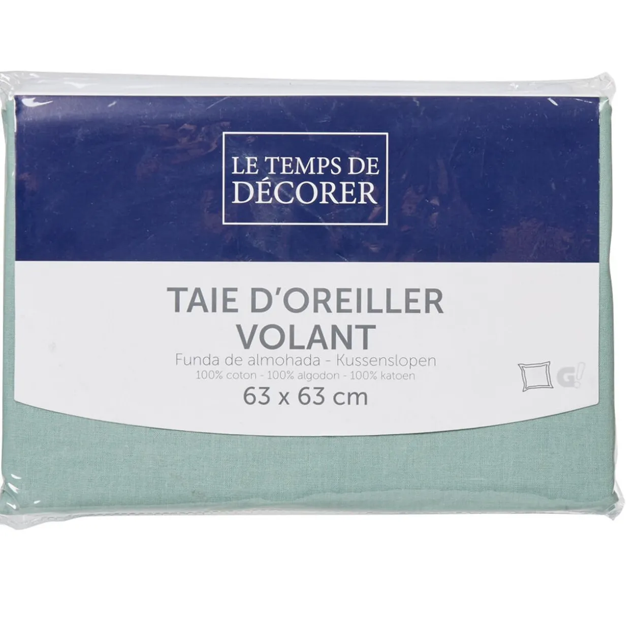 Taie d’oreiller carrée unie de couleur vert d’eau, finition à volants plats.