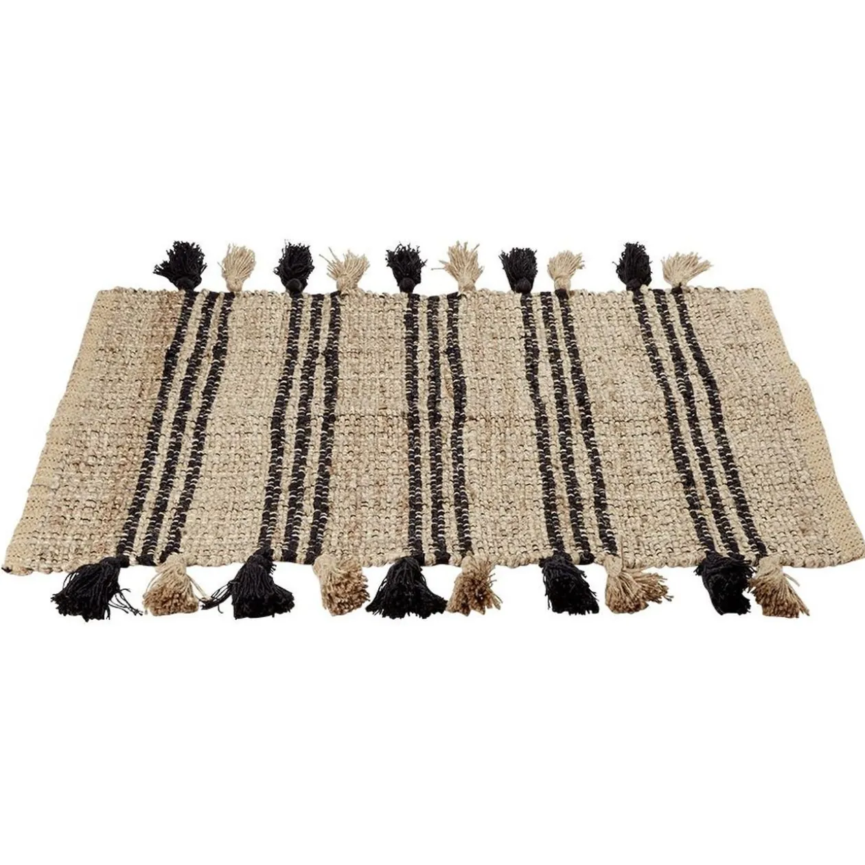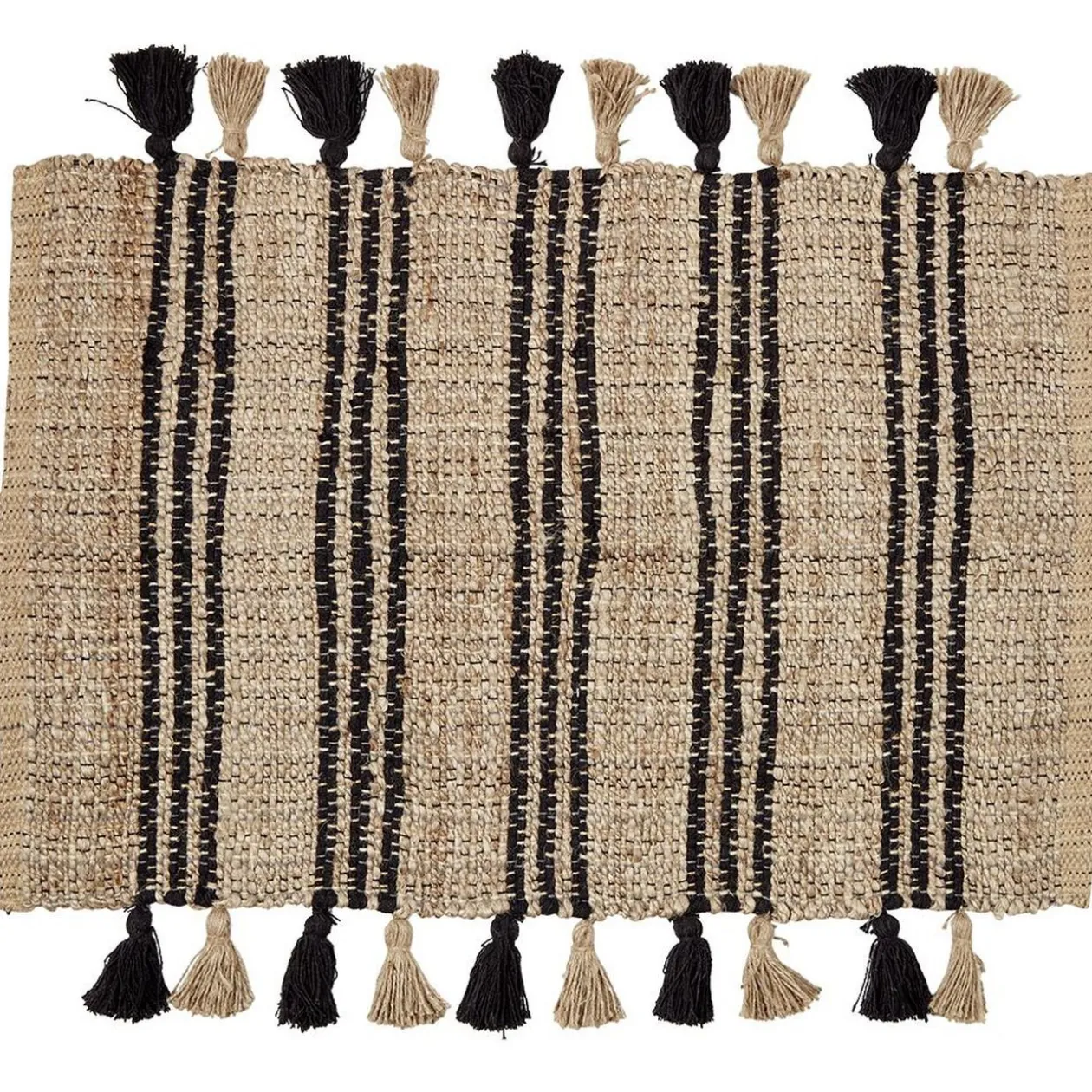 Tapis rond en jute et coton de couleur noire avec pompons, idéal pour tous types de décorations.
