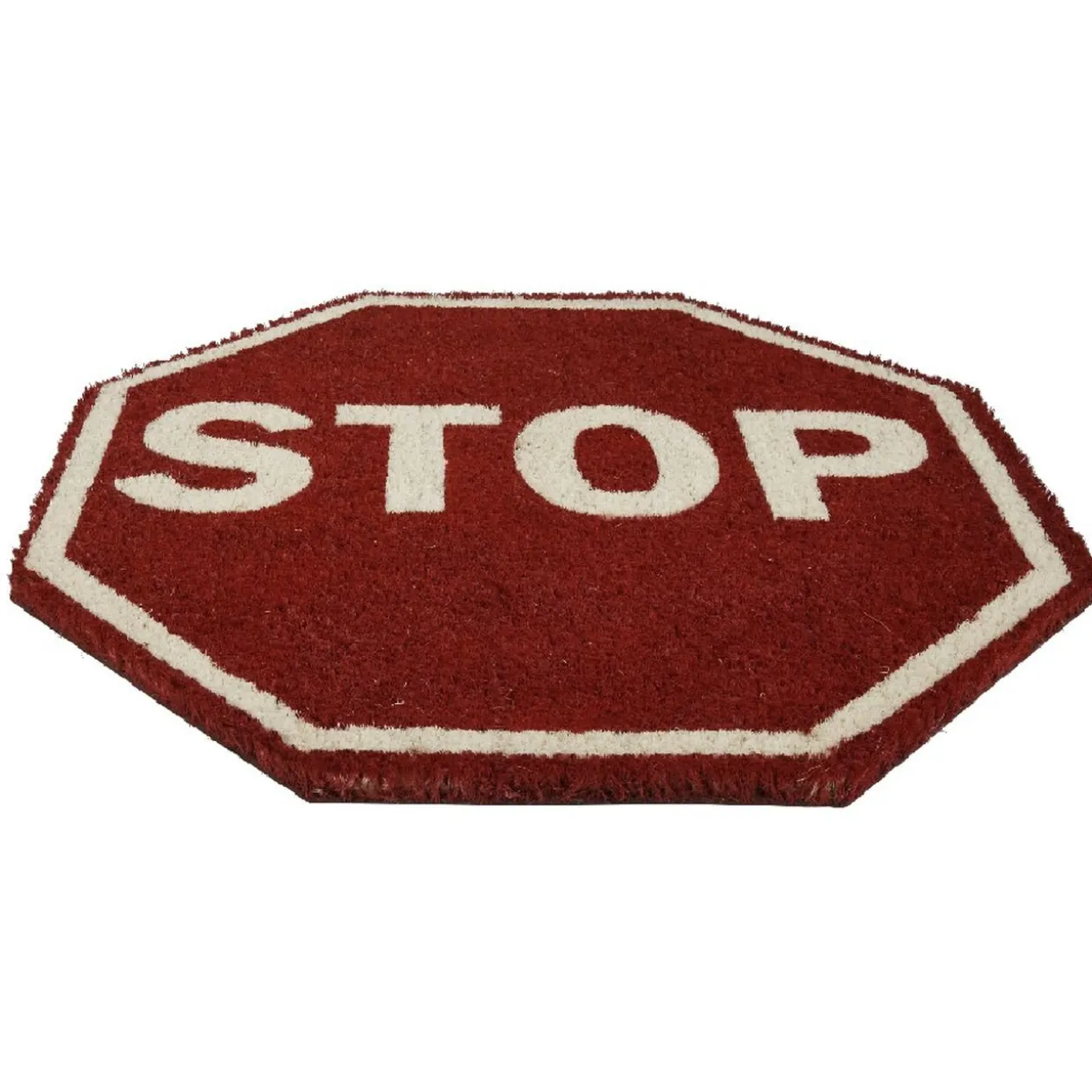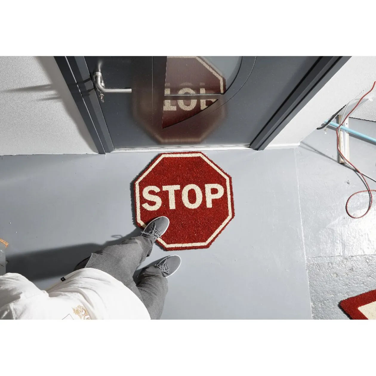 STOP ! Avec ce tapis original en forme de panneau STOP, vous serez obligés de vous arrêter pour vous essuyer les pieds avant de rentrer.