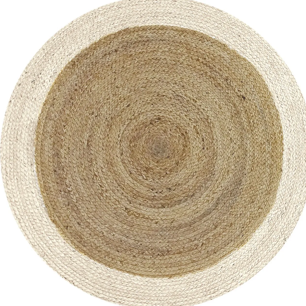 Tapis rond en jute avec bordure beige, idéale pour apporter une belle touche finale à votre décoration intérieure.