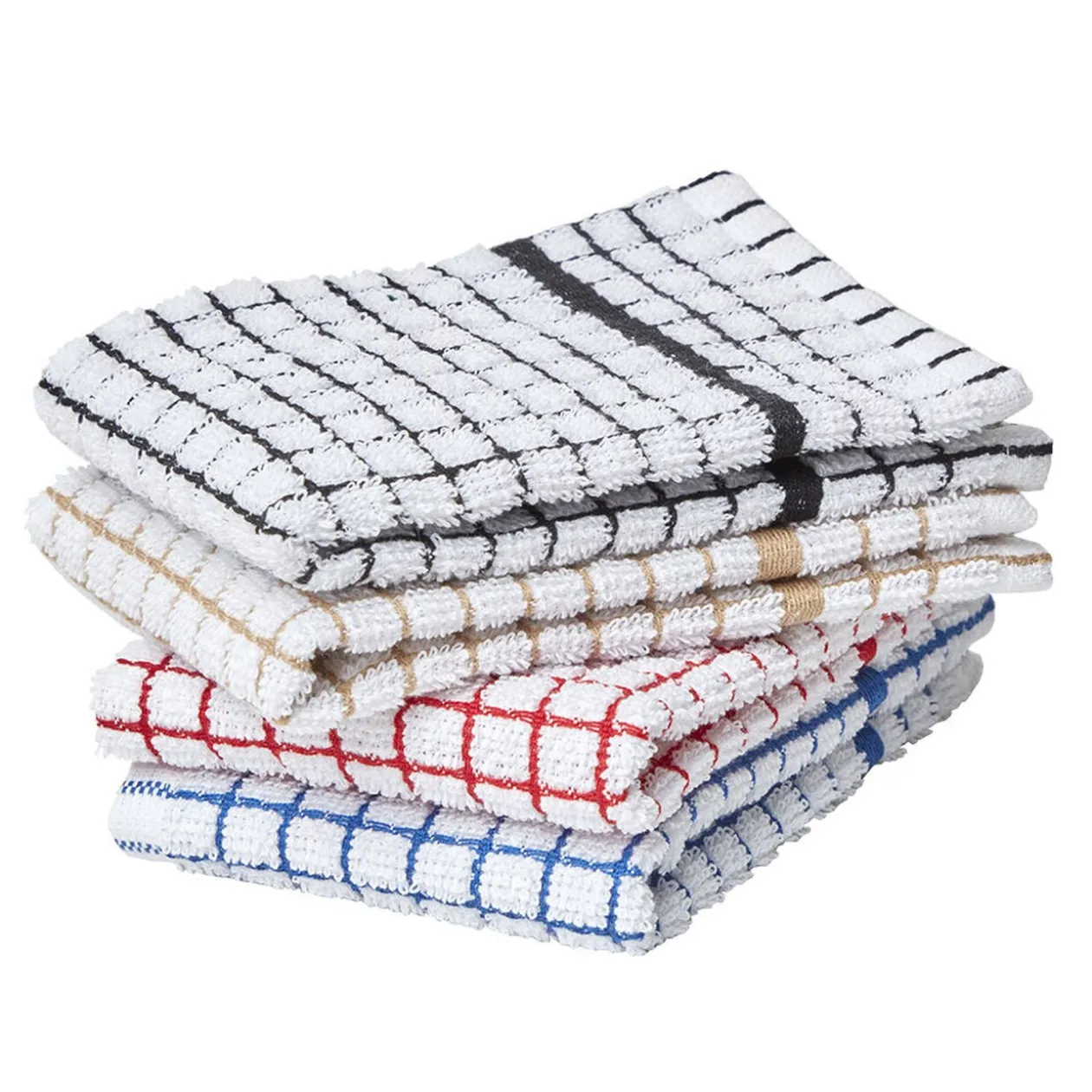 Lot de 4 torchons de cuisine blanc à carreaux : bleu, rouge, gris et noir.