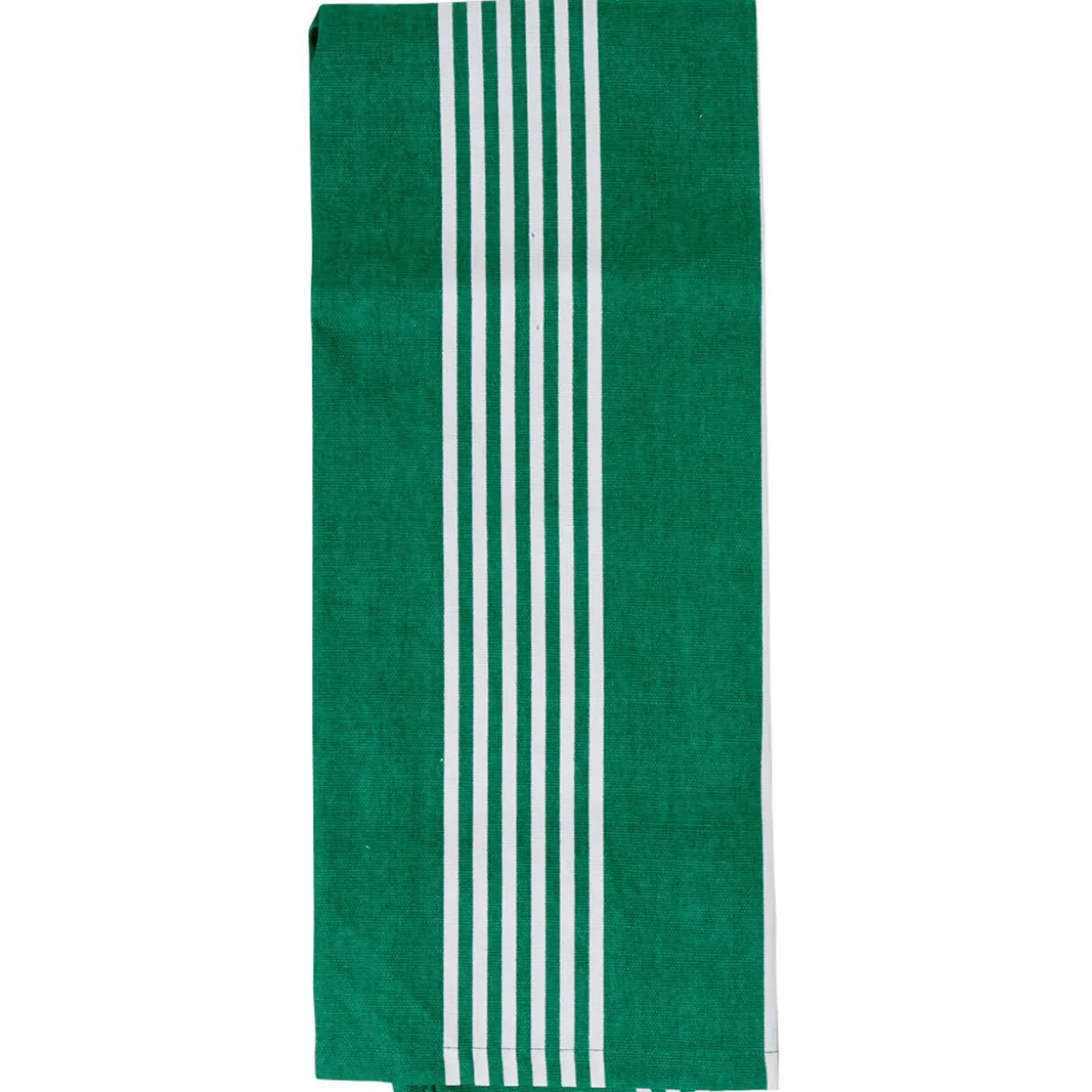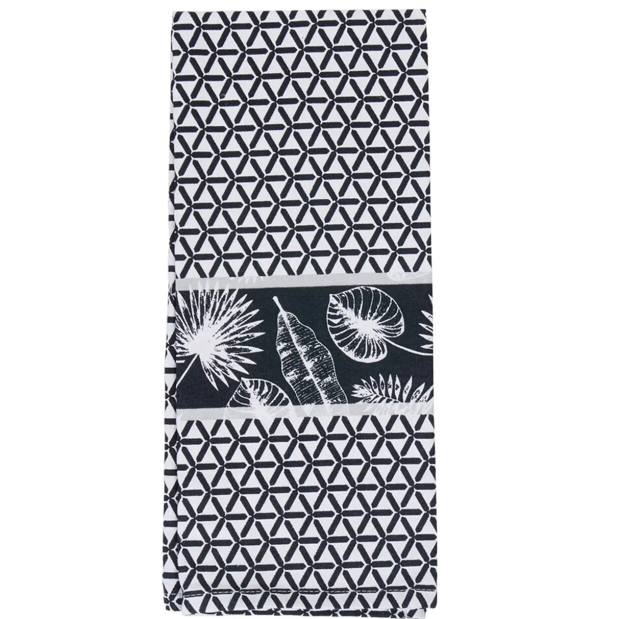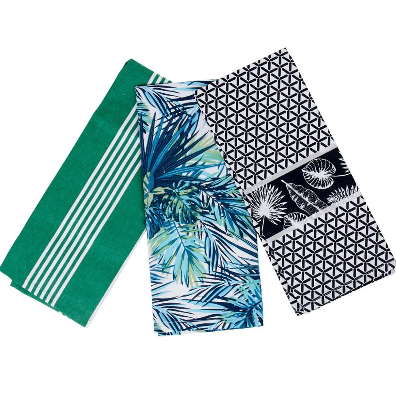 Lot de 3 torchons de cuisine : un imprimé feuillage tropical vert, un blanc et vert rayé et le dernier à motif géométrique blanc et noir.