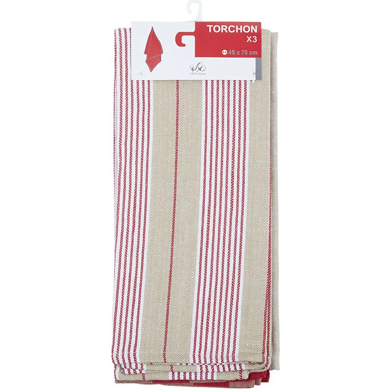 Lot de 3 torchons en coton tissé rayé marron et rouge.
