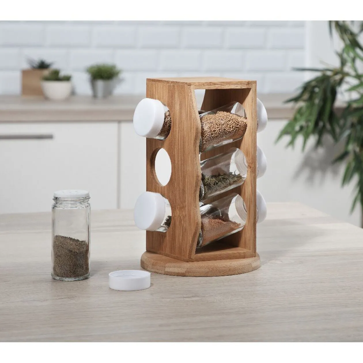 Tour à épices en bambou avec 6 pots inclus avec couvercles. Idéal dans la cuisine pour ranger les épices ou encore les herbes aromatiques.