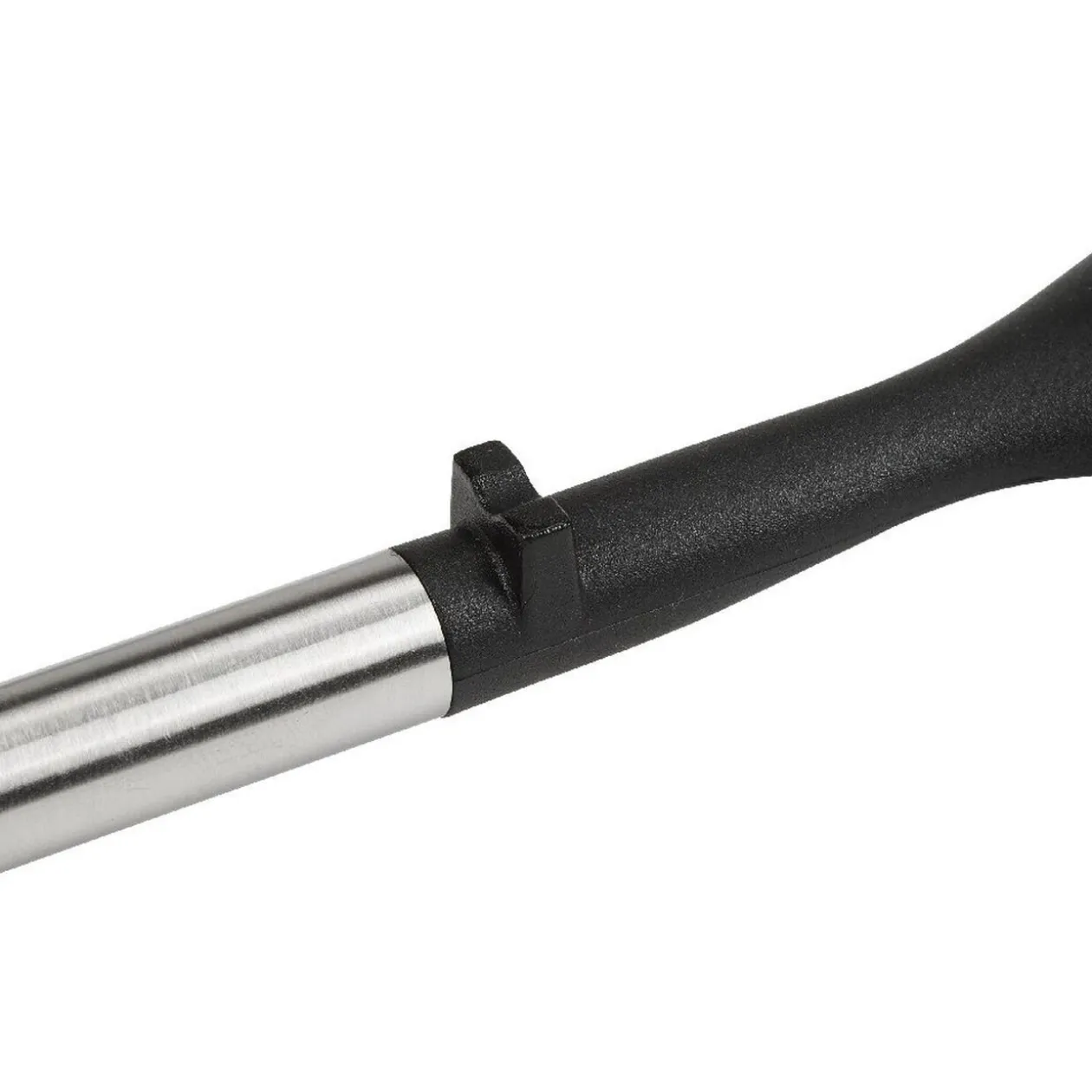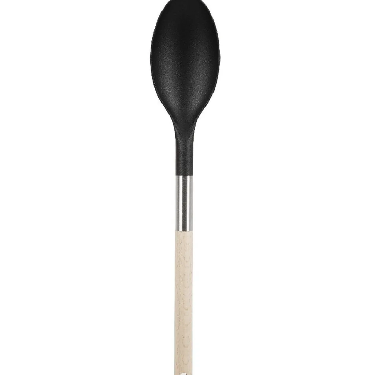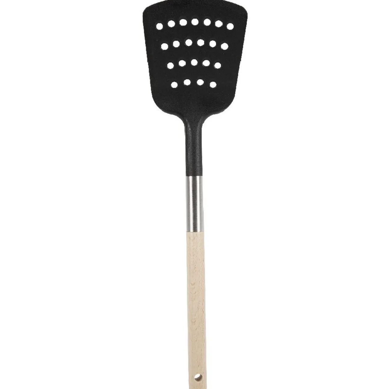Set de 4 ustensiles de cuisines manche en bois et inox avec spatule en plastique noir.