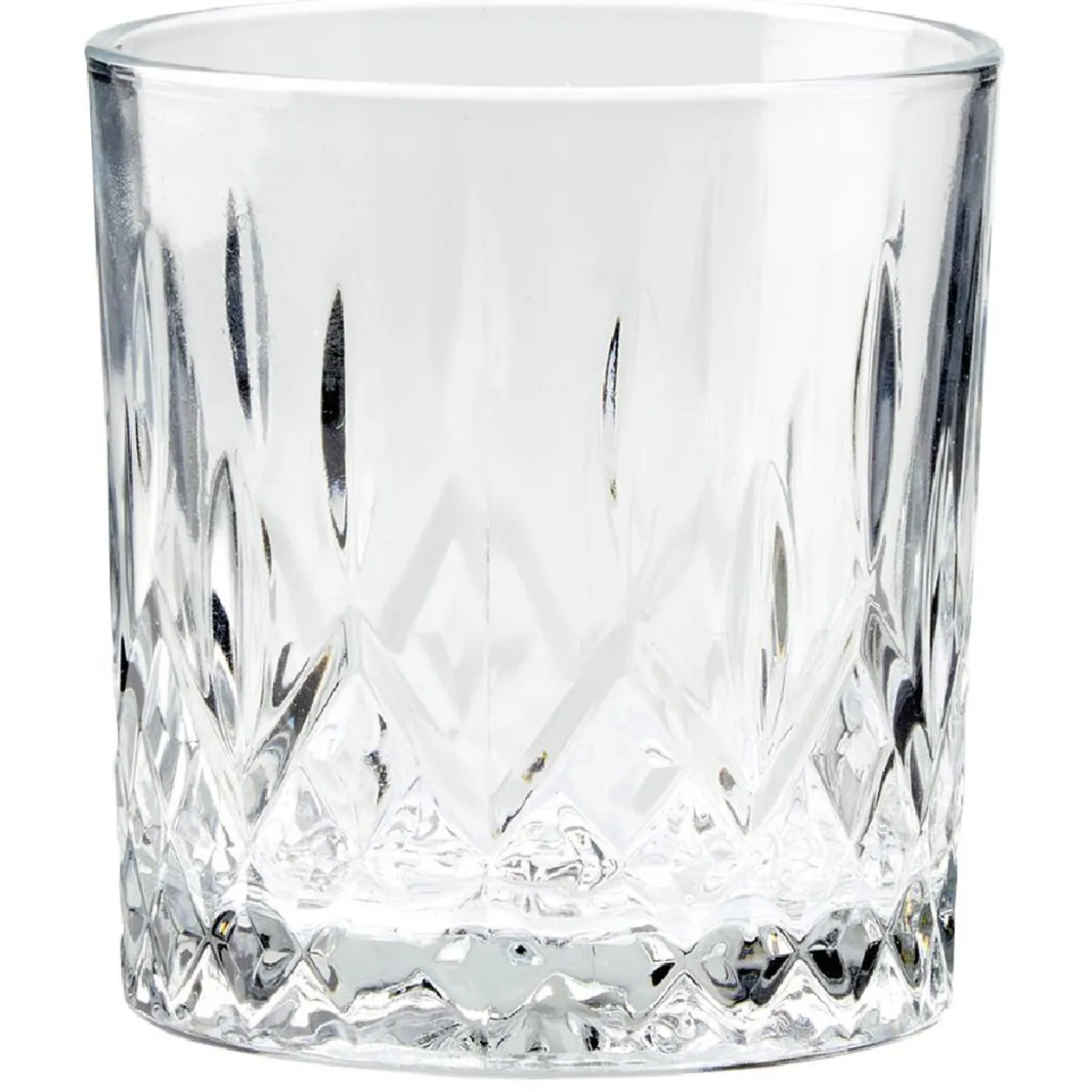 Lot de 4 verres à whisky Odin transparents ciselés d’une contenance de 33 cl.