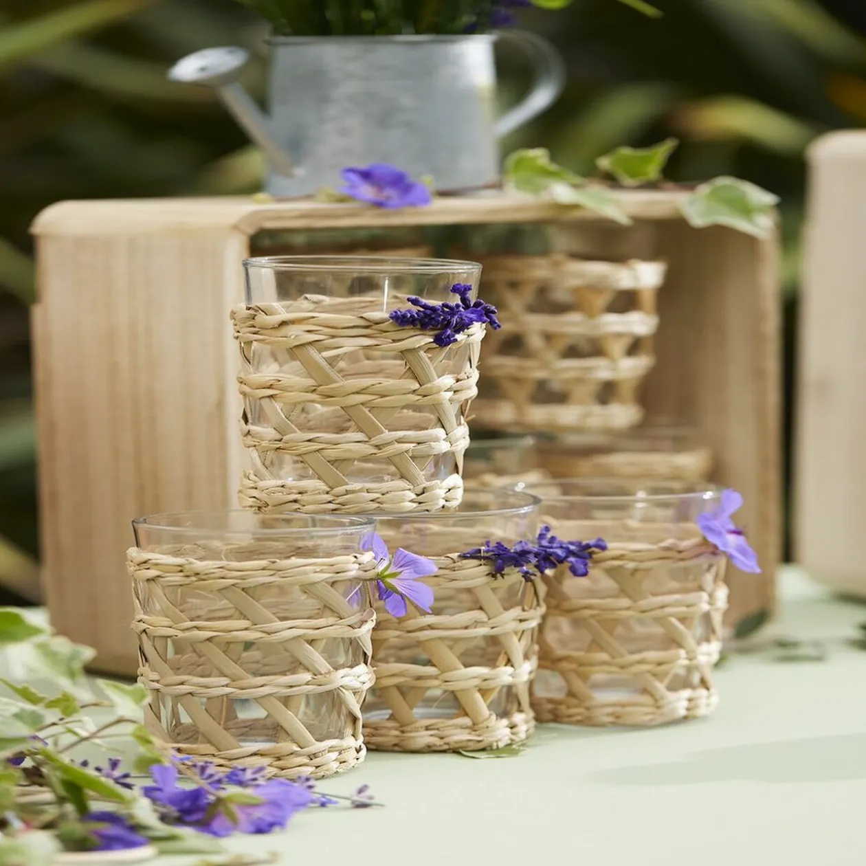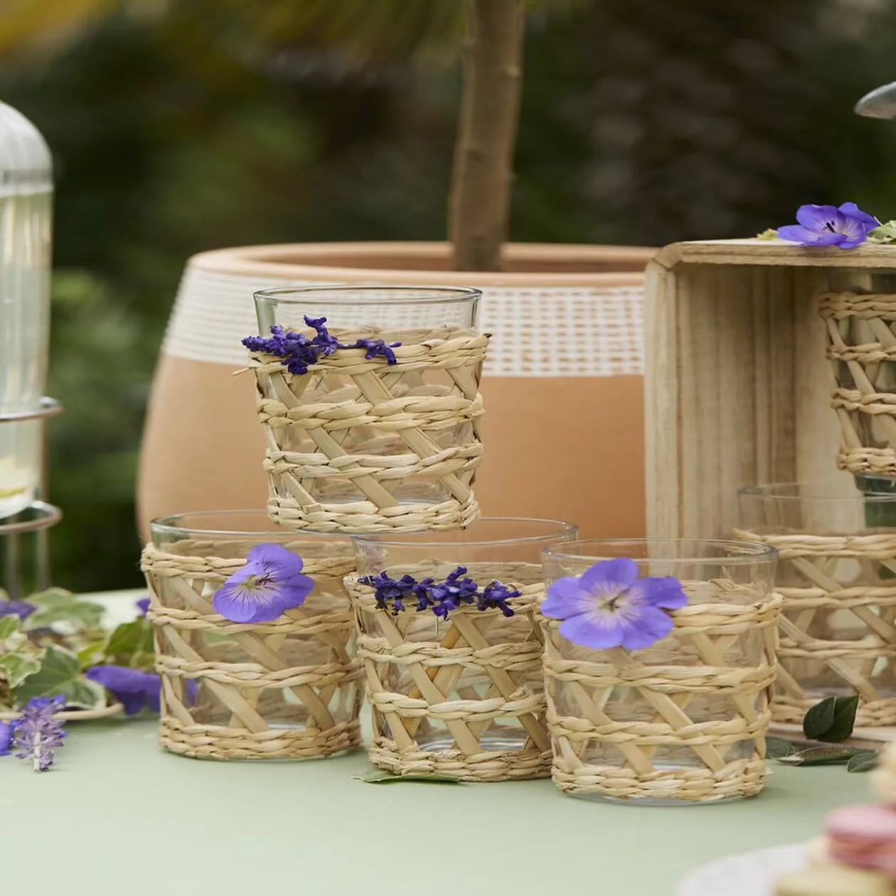 Transparent, ce verre accompagné d’une finition en raphia naturel, offre des dimensions de 8 cm de diamètre et 12,5 cm de hauteur.