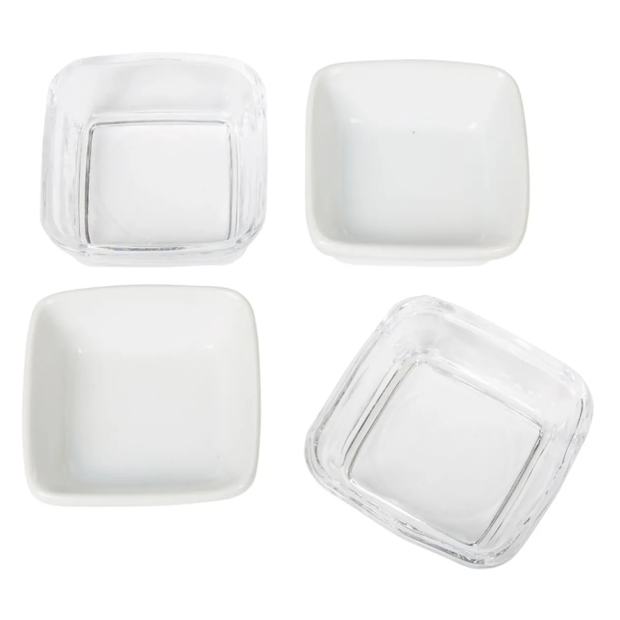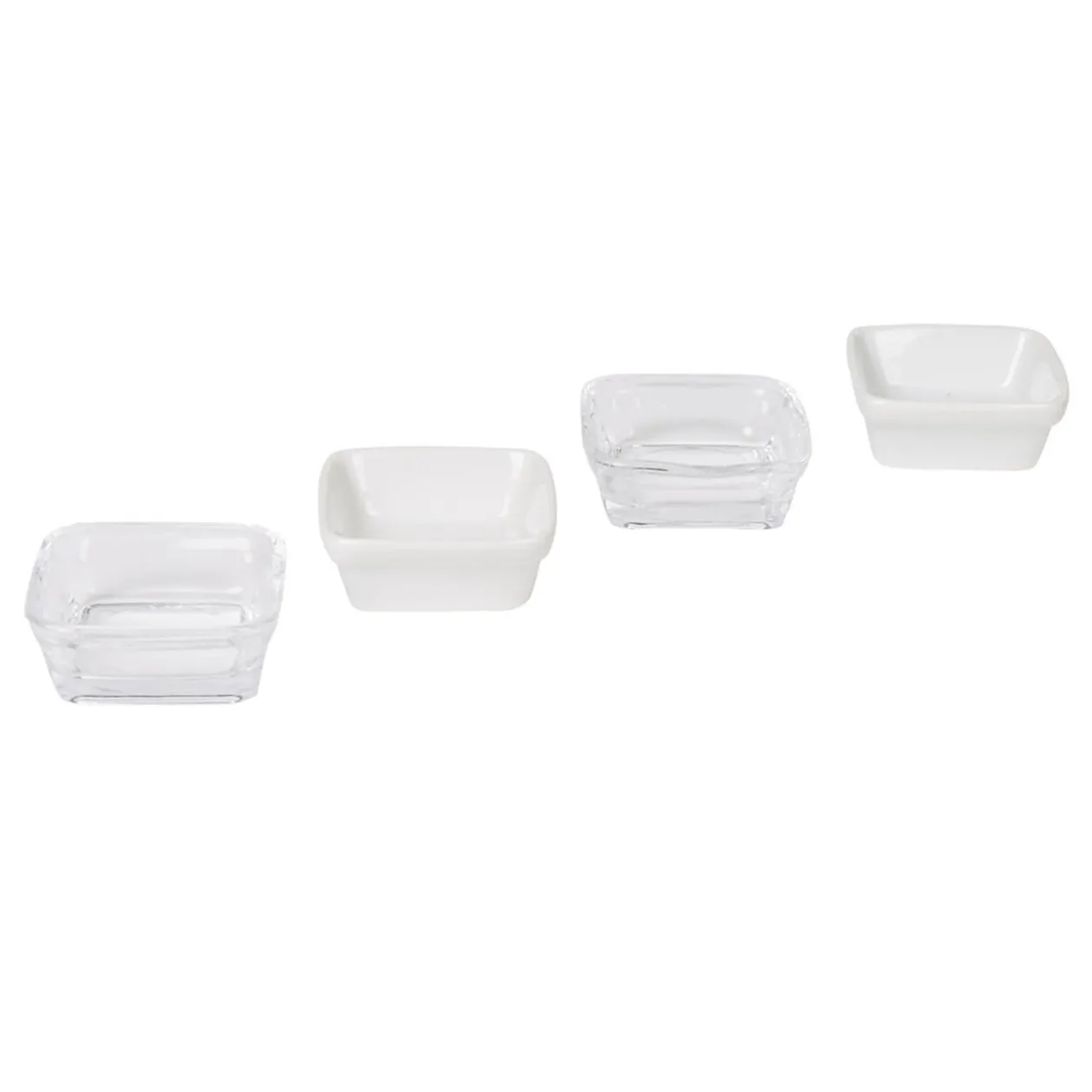 Set de 4 verrines carrées en verre, 2 transparents et 2 blancs.