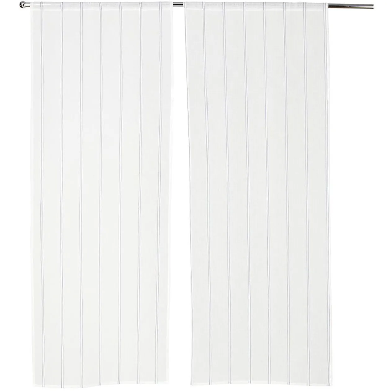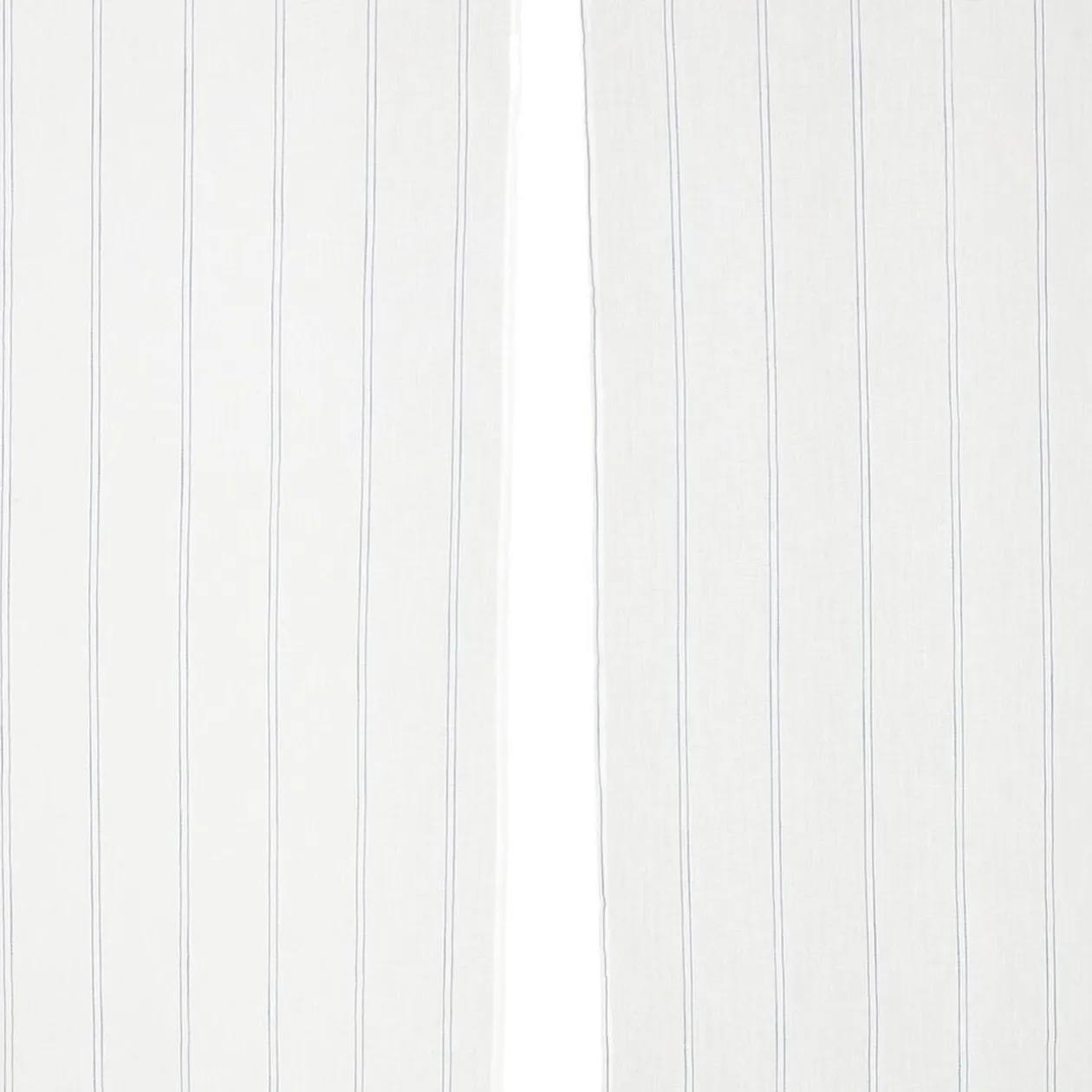 Paire de vitrages blancs à rayures bleues à placer devant vos fenêtres pour laisser entrer la lumière du soleil sans vis-à-vis.