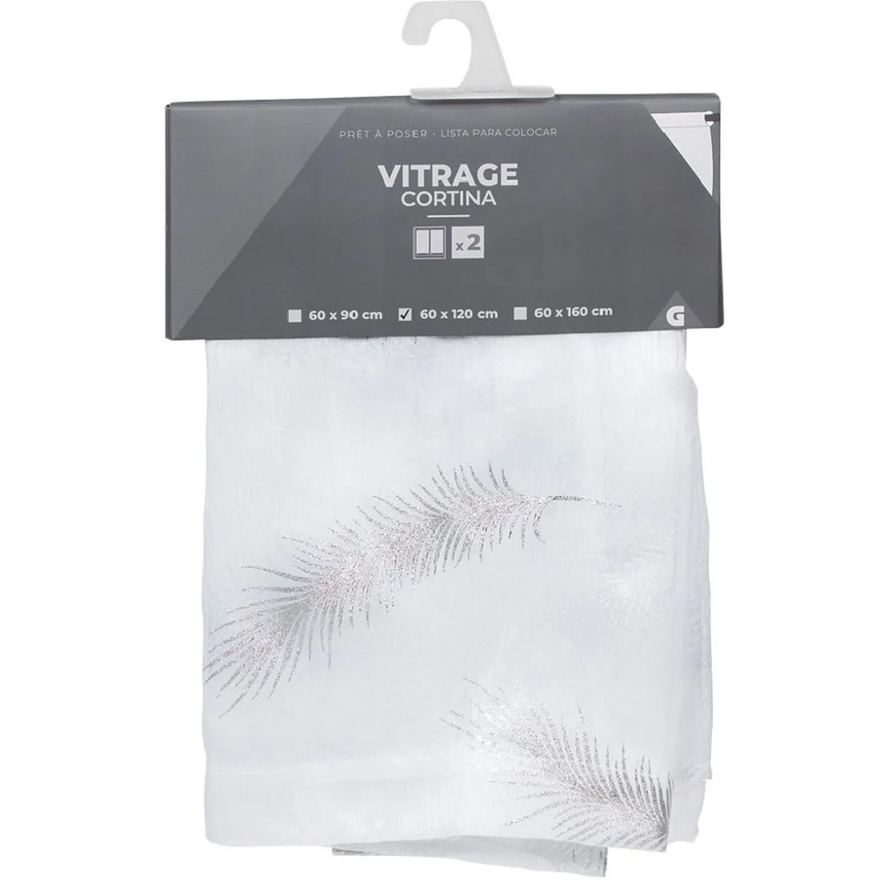 Paire de vitrage blanc avec imprimé de plumes argentées.