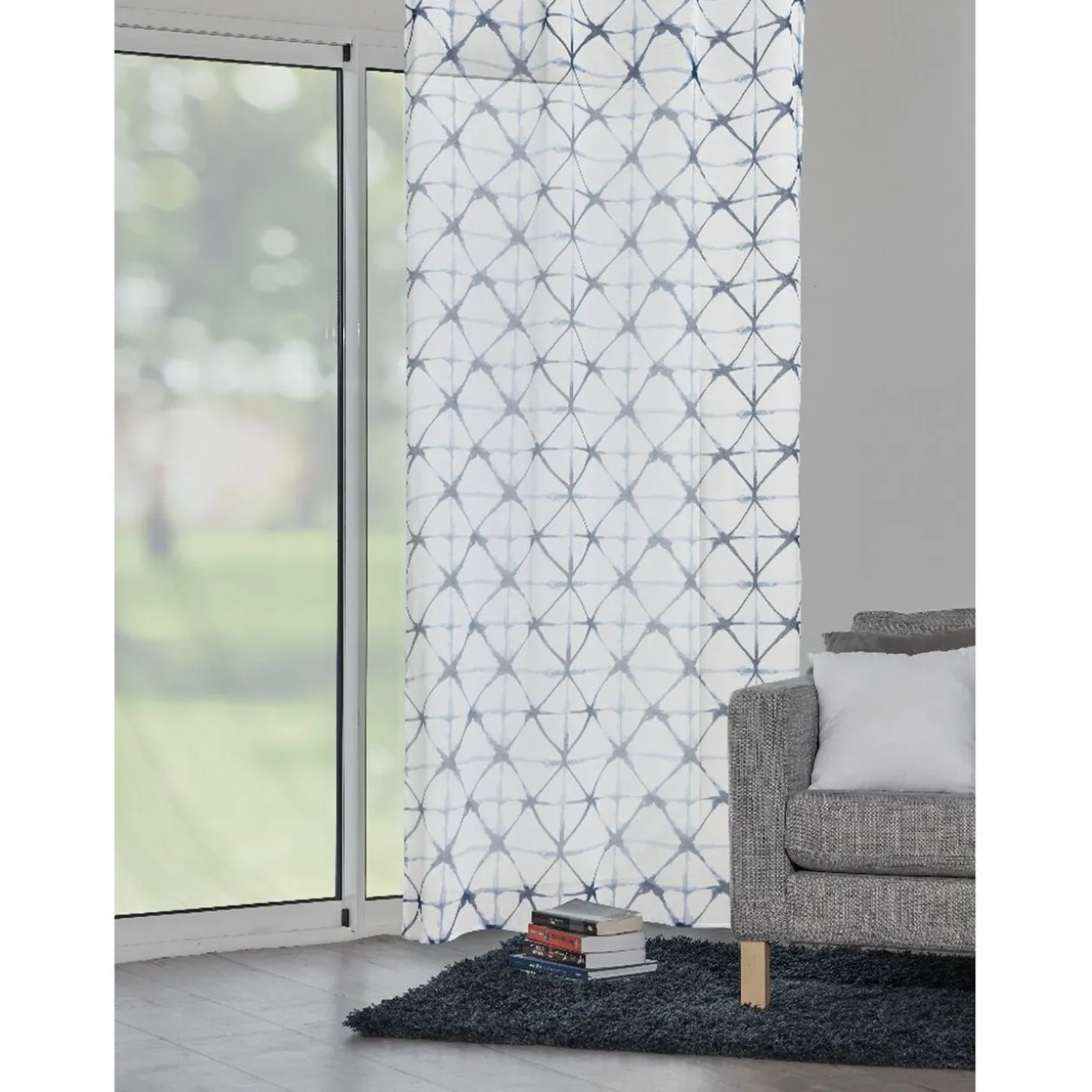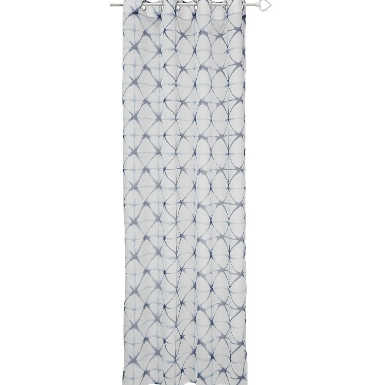 Voilage blanc et bleu imprimé losanges, avec oeillets, idéal pour habiller votre pièce avec une décoration inspirante de style gecque!