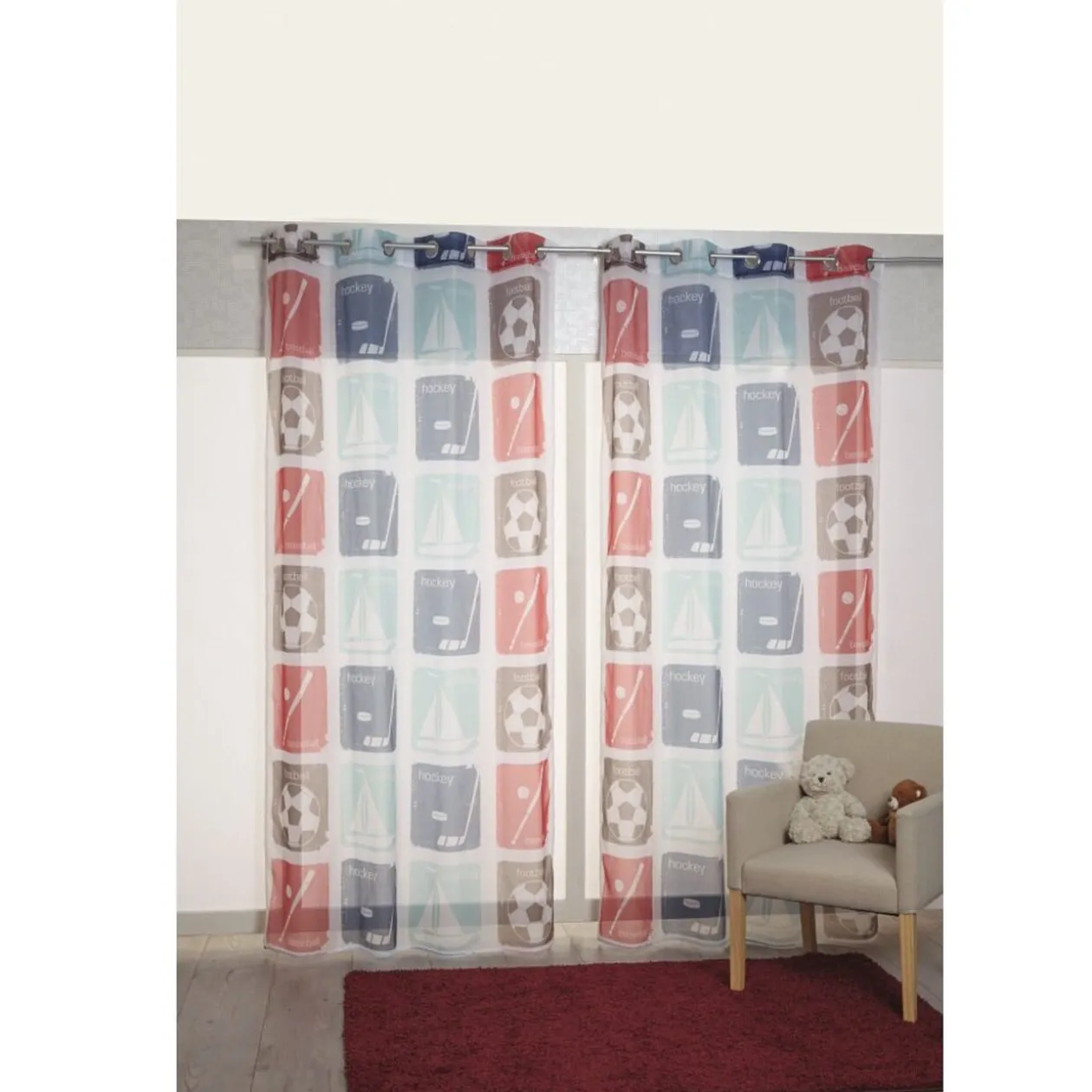 Rideau voilage à oeillets design sport, idéal pour chambre d’enfants, dim. 140×240 cm, polyester.