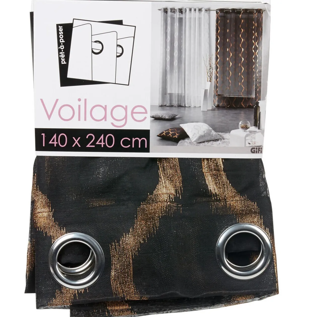 Voilage à oeillets fond noir lignes brillantes cuivrées, dim. 140×240 cm, 100 % polyester.