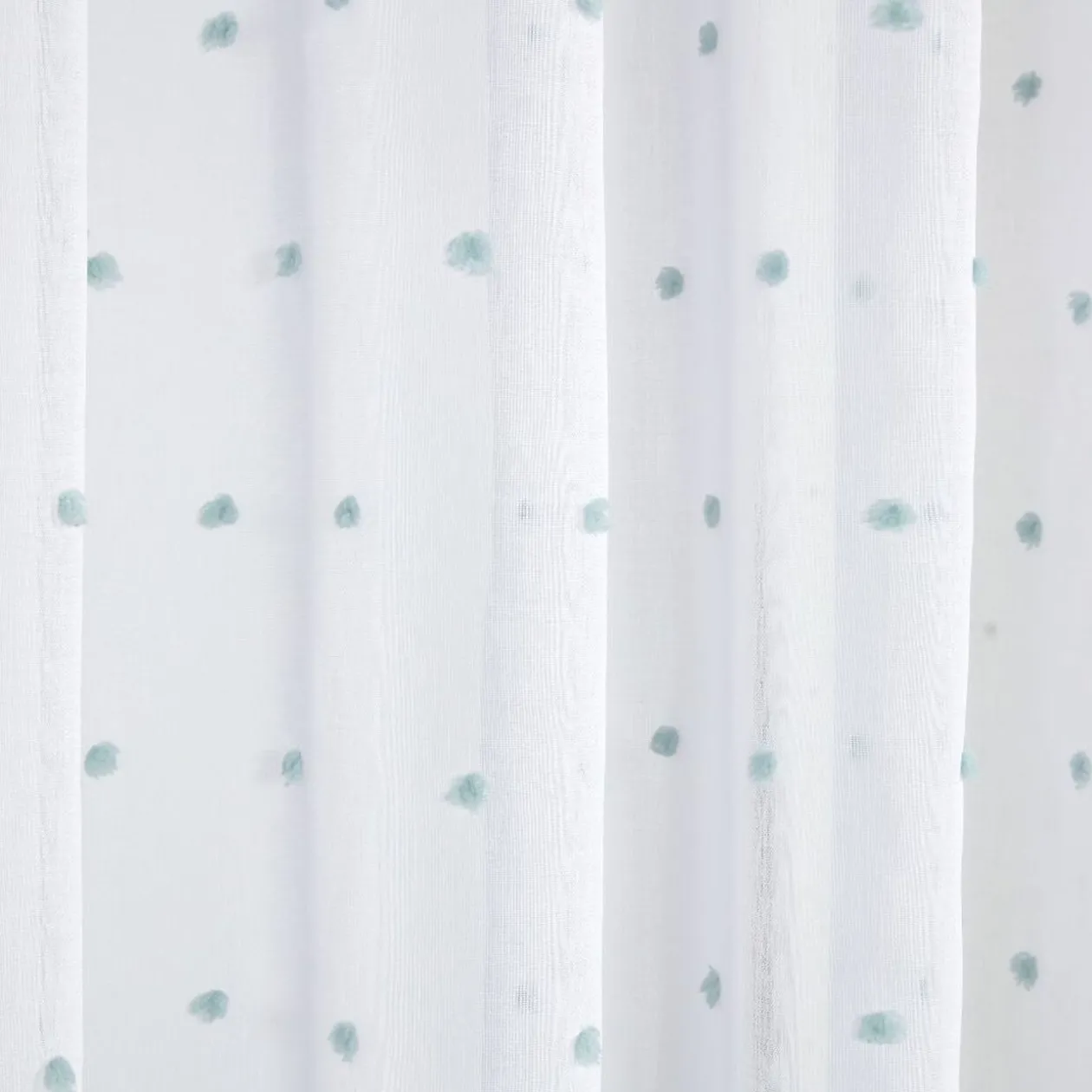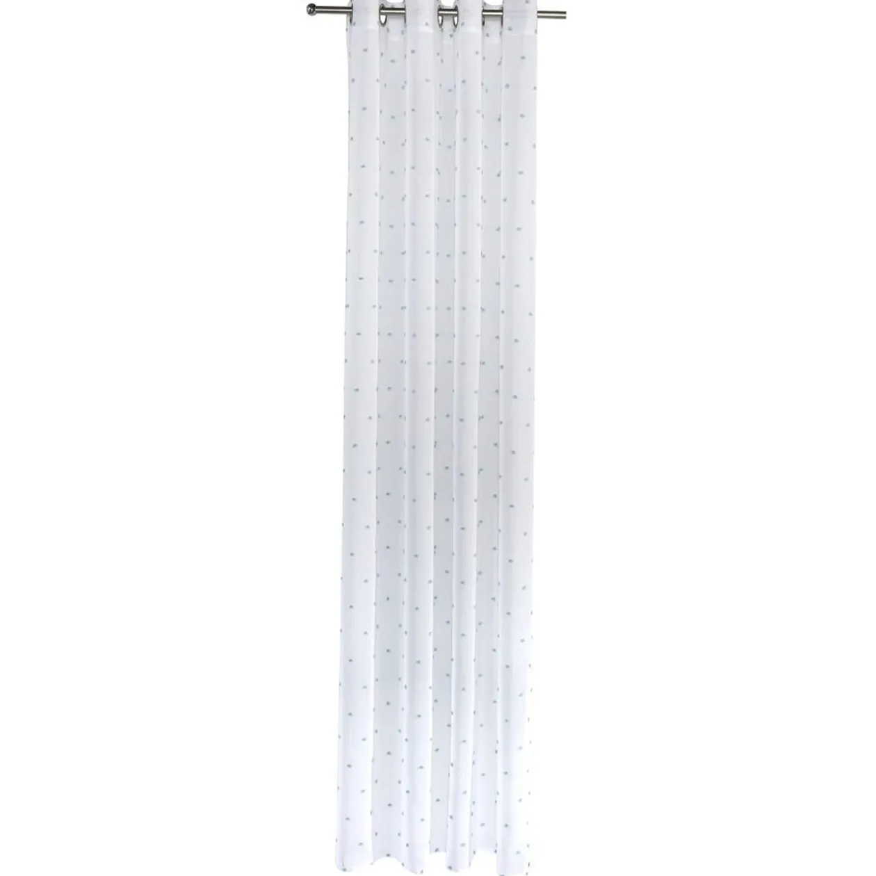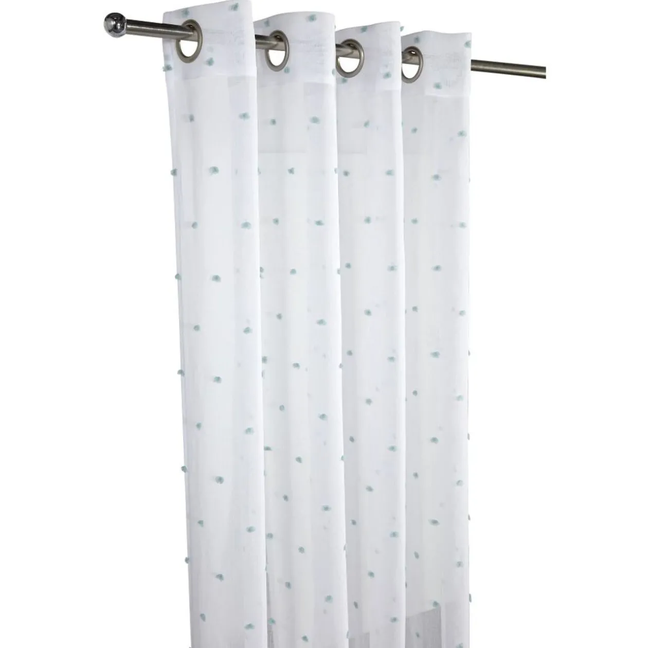 Voilage à oeillets métallique uni couleur blanche agrémenté de pompons bleus.
