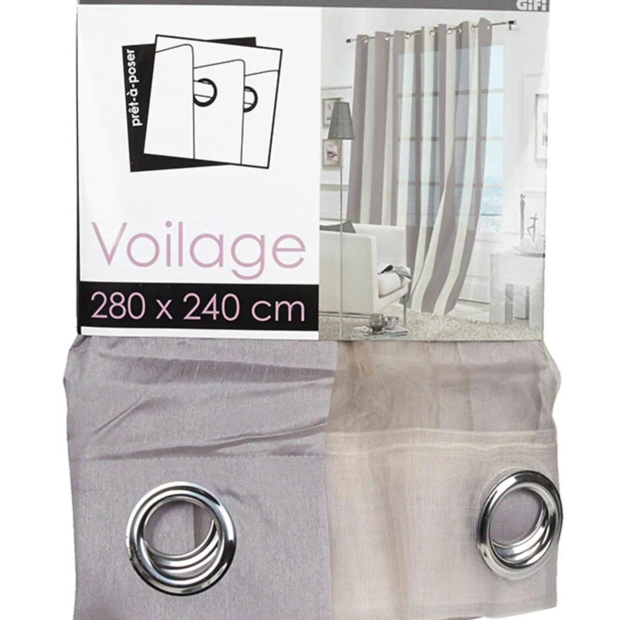 Rideau voilage à oeillets gris pour baie vitrée, dim. 280×240 cm, 100 % polyester.