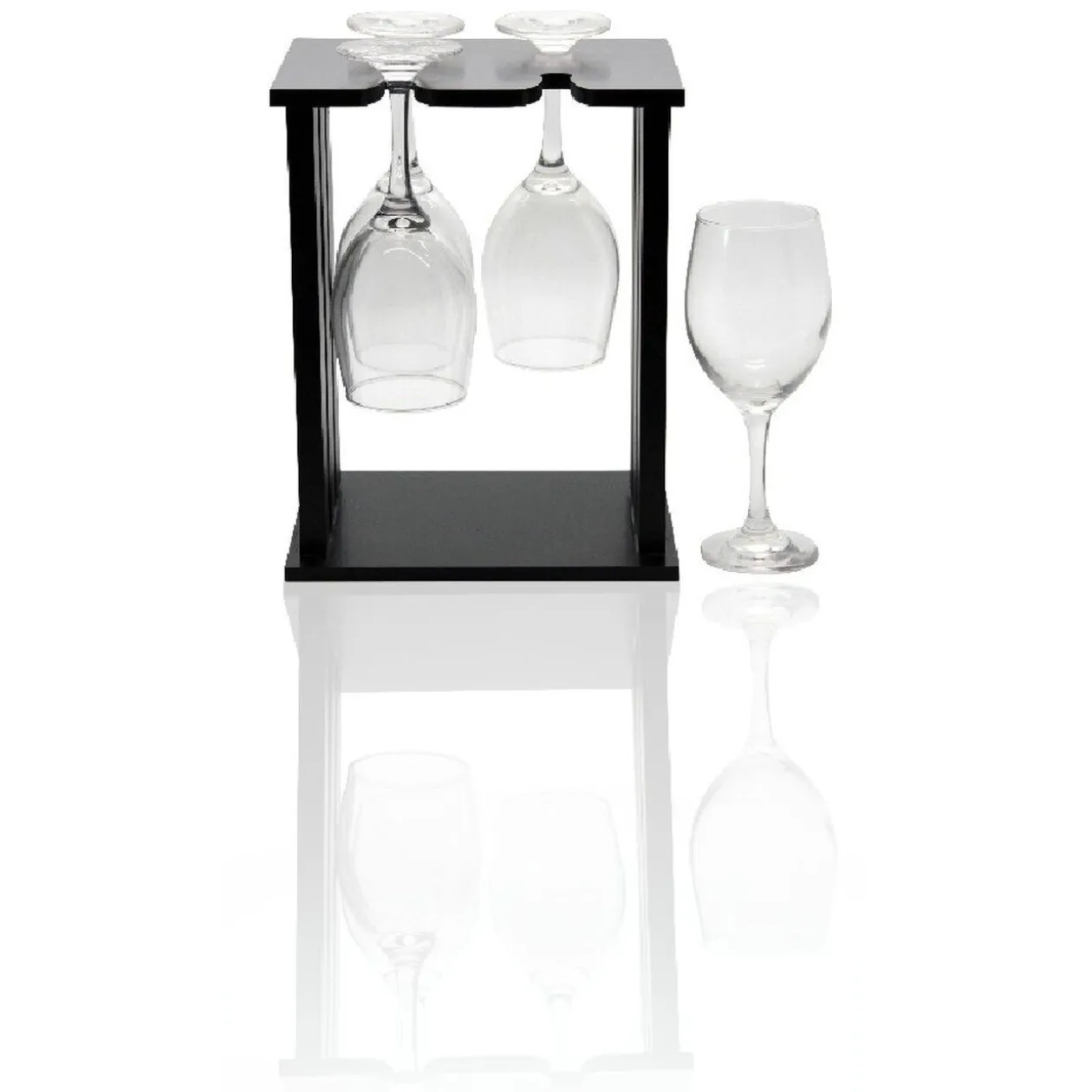 Lot de 4 verres à vin transparents avec leur support en bois noir.