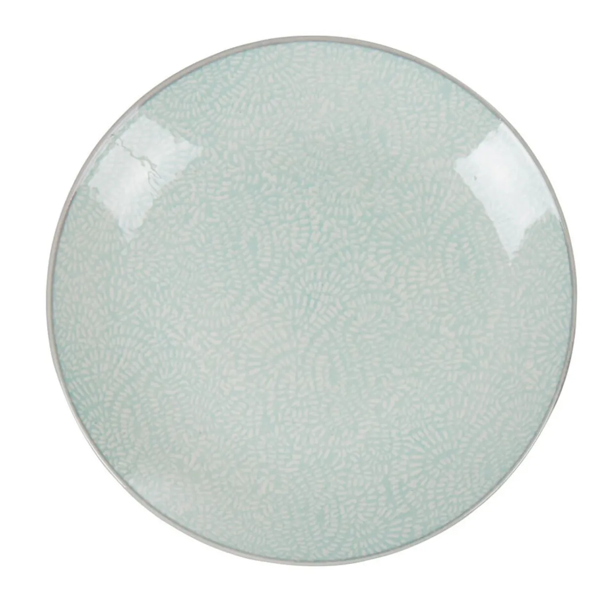 Assiette à dessert ronde en porcelaine avec un discret motif goutte dans les tons beige et un liseré bleu clair.